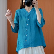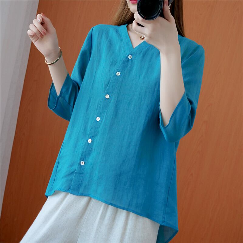 スラントブレストラミーブラウス2021年春夏新作無地Vネックレトロ文芸ルーズミドルスリーブラージサイズシャツレディース 大きめサイズ スプリング 春物 サマー 夏物 ソリッドカラー TB2-12 TB2-1234859177925