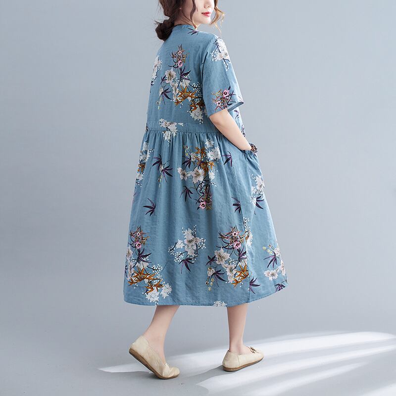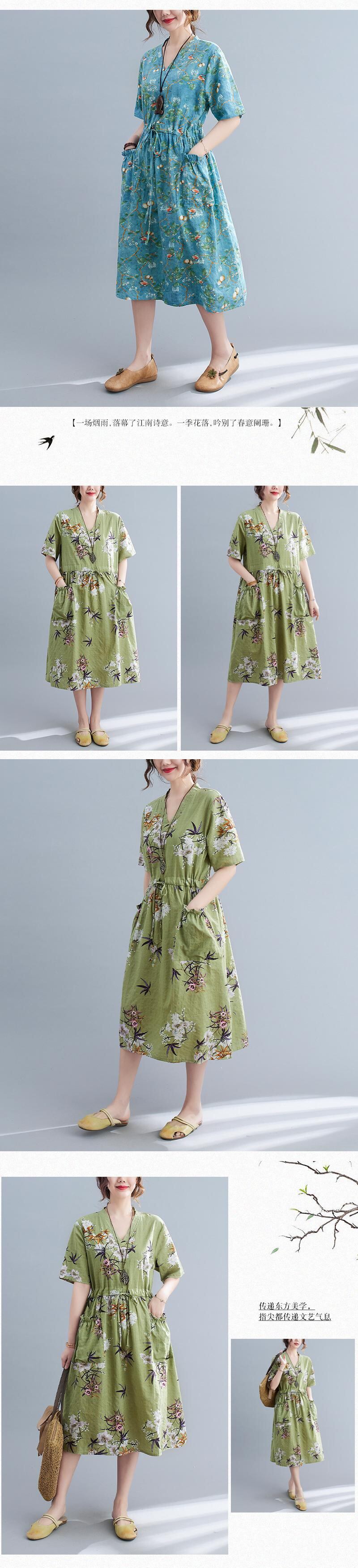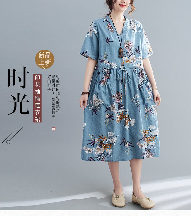 2021年プラスサイズのスリムコットンとリネンドレス膝上にロングVネックプリントリネンスカート半袖ルーズスカート 大きめサイズ TB2-12 TB2-122669238163