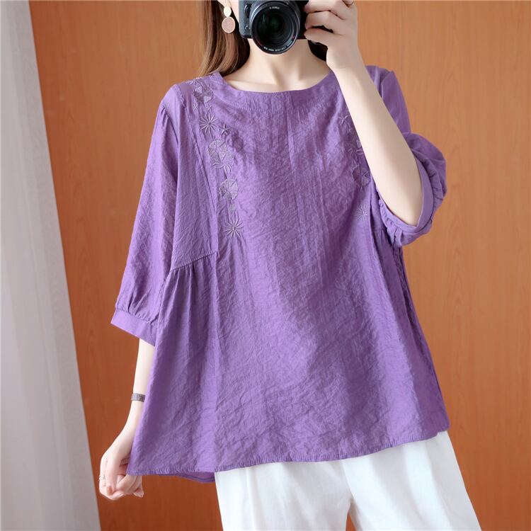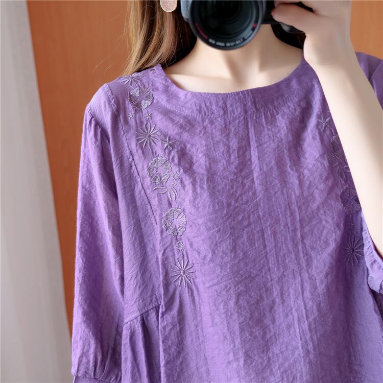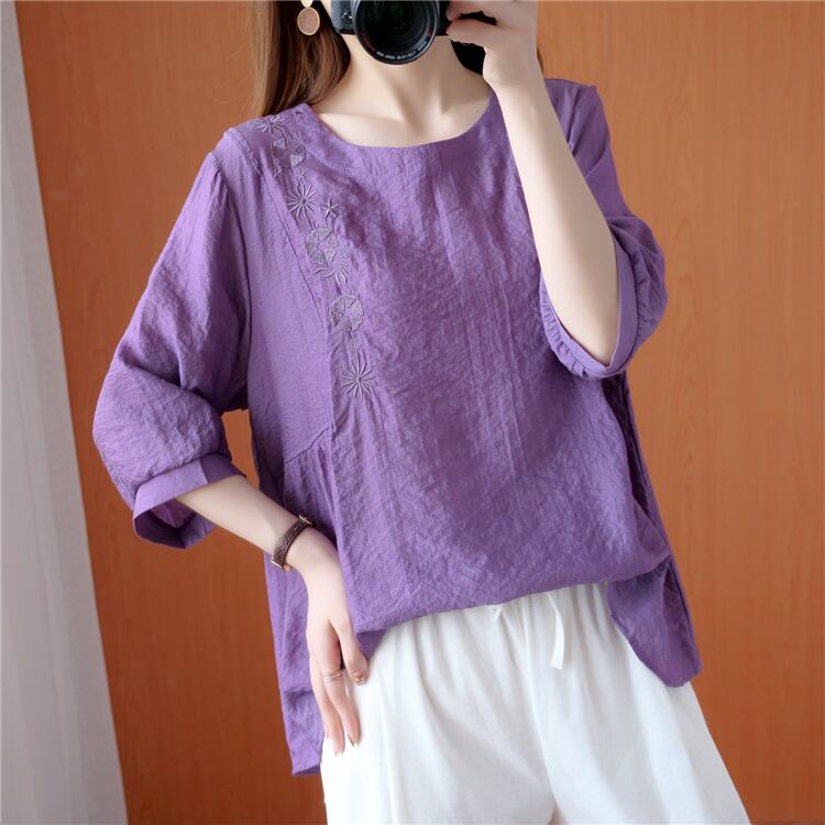2021年夏の新作刺繍フラワー無地ラミールーズ&シンTシャツウエストウエストトップ女性ミドルスリーブコットン&リネンシャツ レッド サマー 夏物 ソリッドカラー フラワーデザイン TB2-8 TB2-87725425041