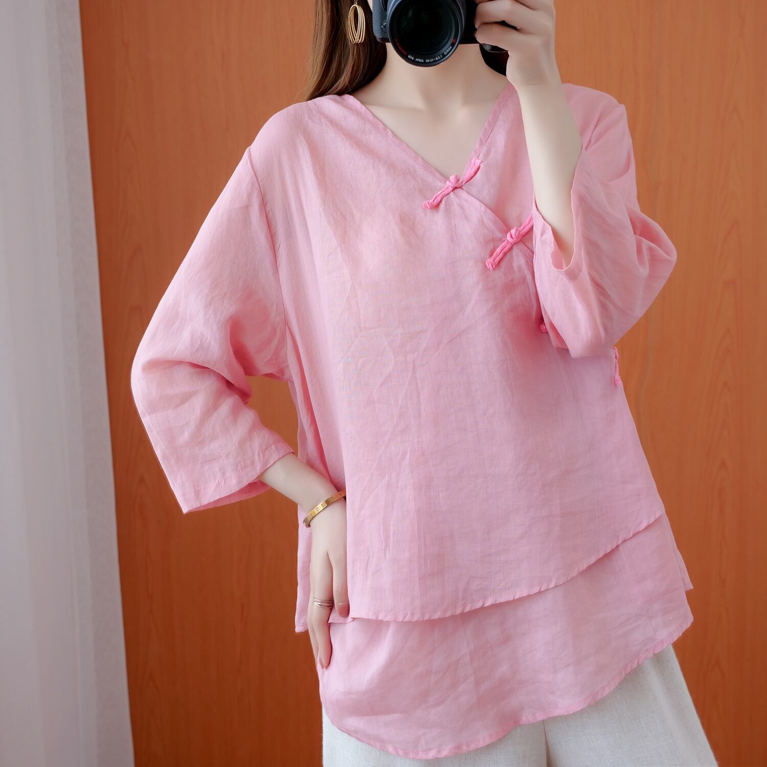 夏の新製品2021レトロオールマッチディスクボタンラミーシャツルーズプラスサイズ七分袖コットンとリネンカジュアルシャツ女性 大きめサイズ サマー 夏物 TB2-12 TB2-1259289418545