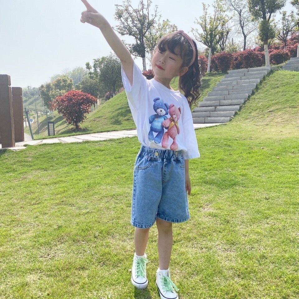 色:H49-ベアTシャツ,O86-5点デニムワイドレッグパンツ,A77-ベアTシャツ+デニムショートパンツ