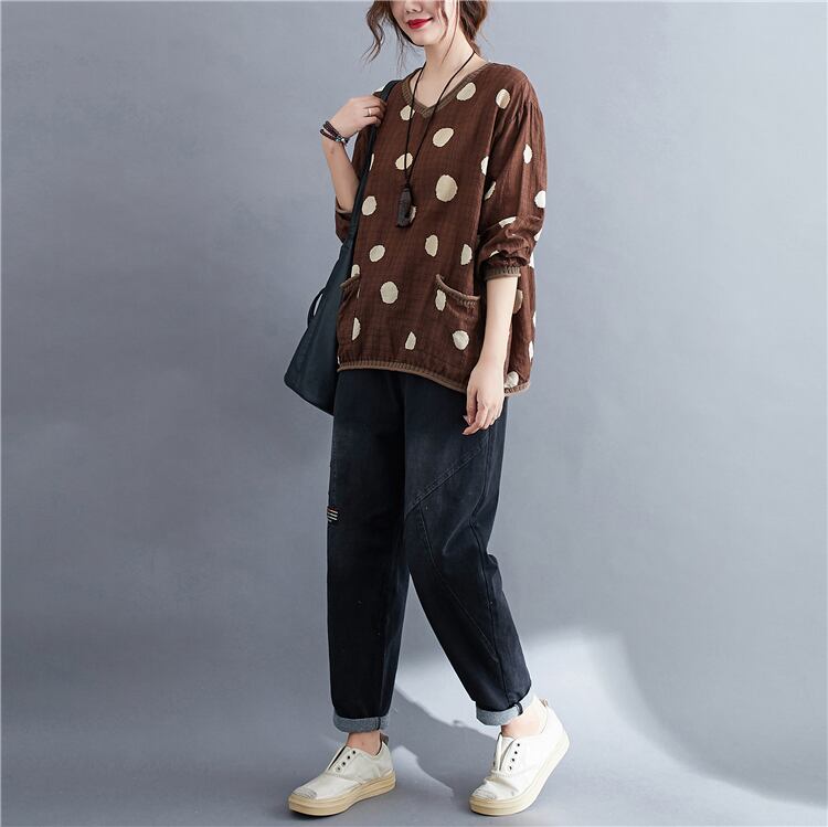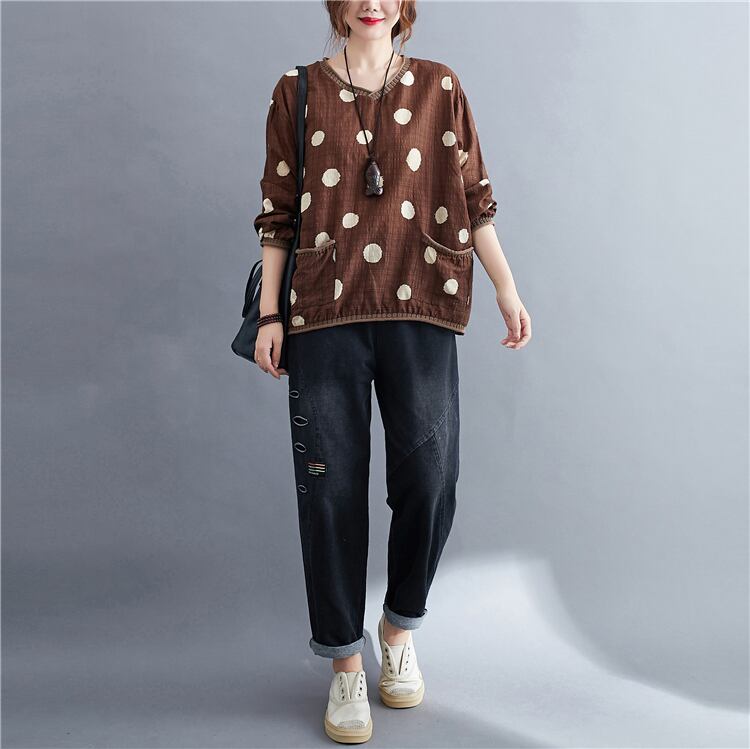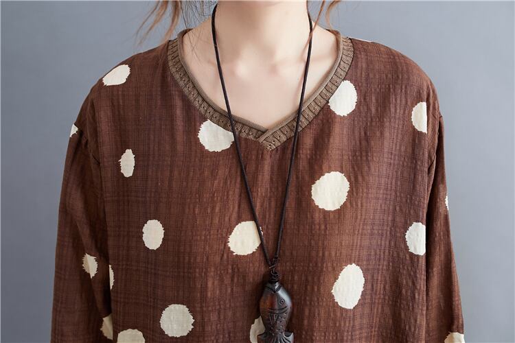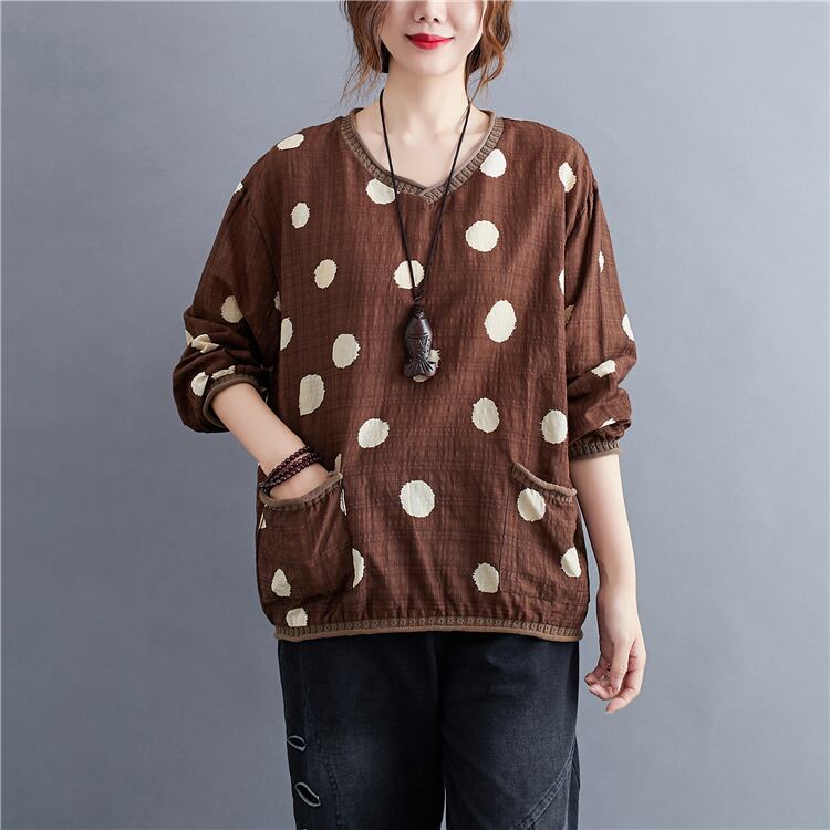 ラージサイズファットmmレトロコットン&リネンTシャツレディース薄Vネックカジュアルポケットボトミングシャツルーズポルカドットプリントトップ秋 大きめサイズ オータム 秋物 TB2-8 TB2-885389781459