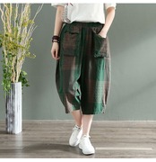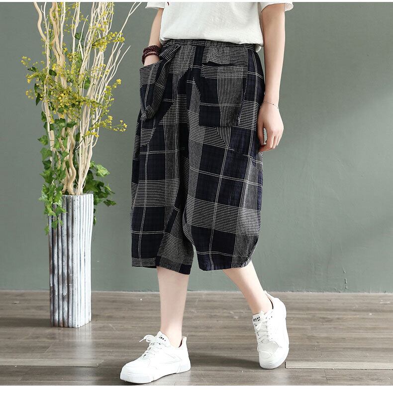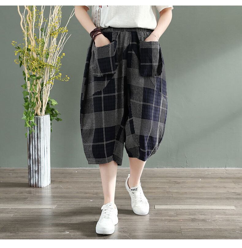 2020レトロチェック柄コットンとリネンワイドレッグパンツ女性ルーズシンリテラリーブルマ夏伸縮性ウエストクロップドハーレムパンツ エラスティック サマー 夏物 ショーツ ブルマー TB2-11 TB2-1167100862712