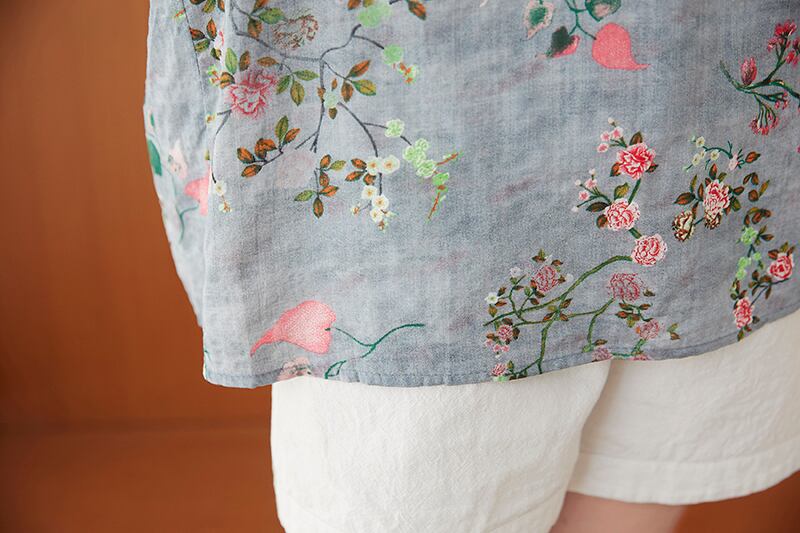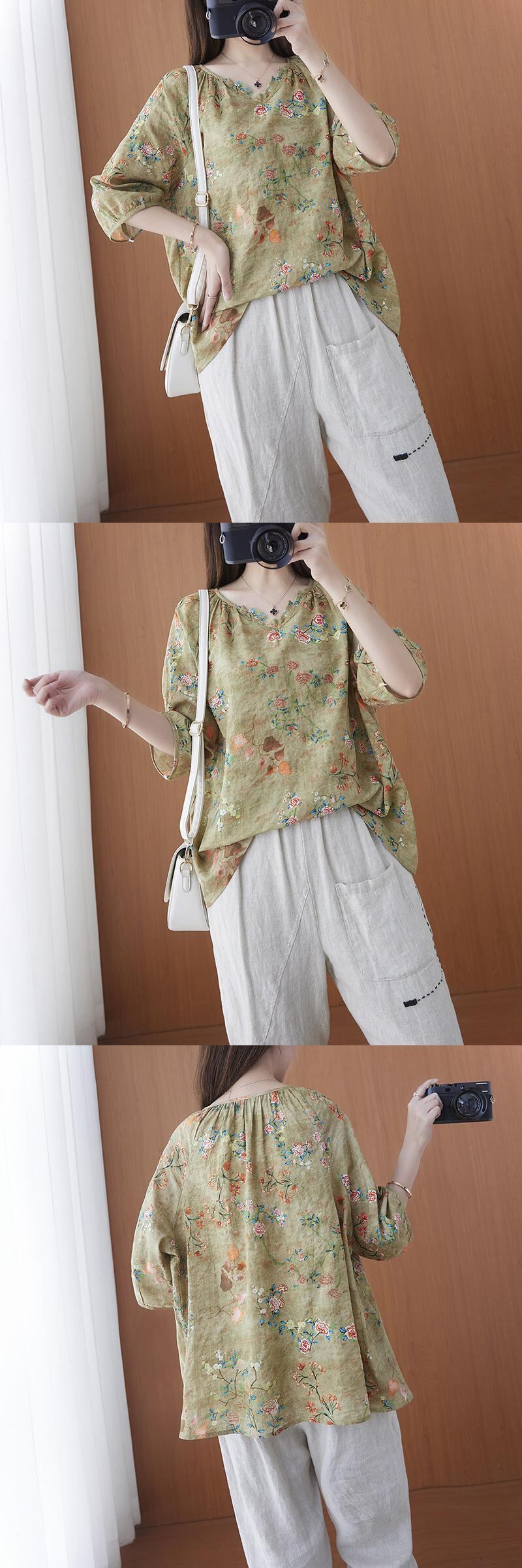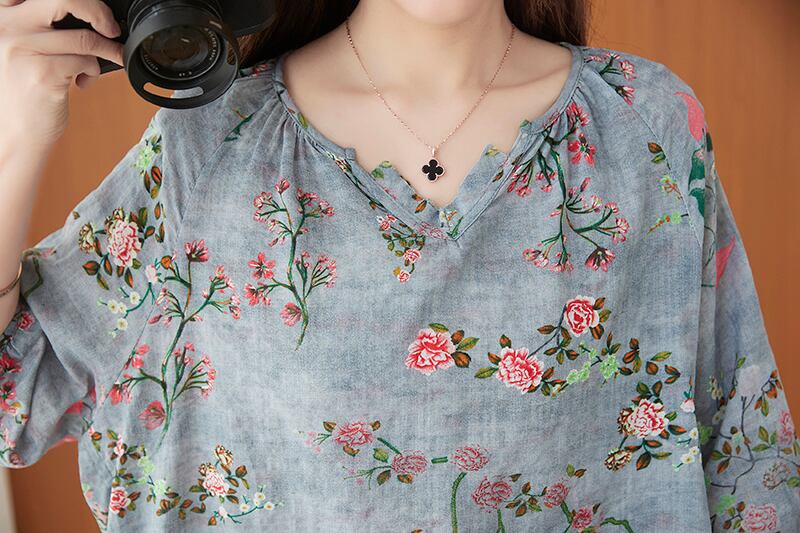 花柄Tシャツ2021年夏の新しいルーズラージサイズのコットンとリネンの半袖シャツ腹と薄いVネックのボトミングシャツをカバーするウエスタンスタイル 大きめサイズ サマー 夏物 TB2-8 TB2-851904286621
