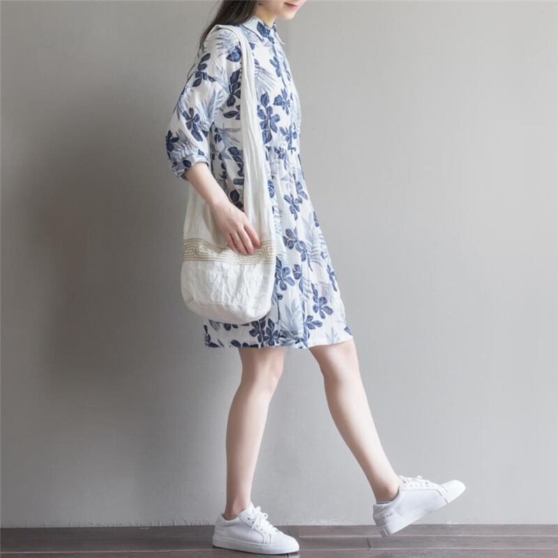 森レディースコットン&リネンワンピースサマーニュースタイルリテラリープリントミドル丈ルーズ七分袖シャツスカートツーピーススーツ 夏物 TB2-8 TB2-838777701158