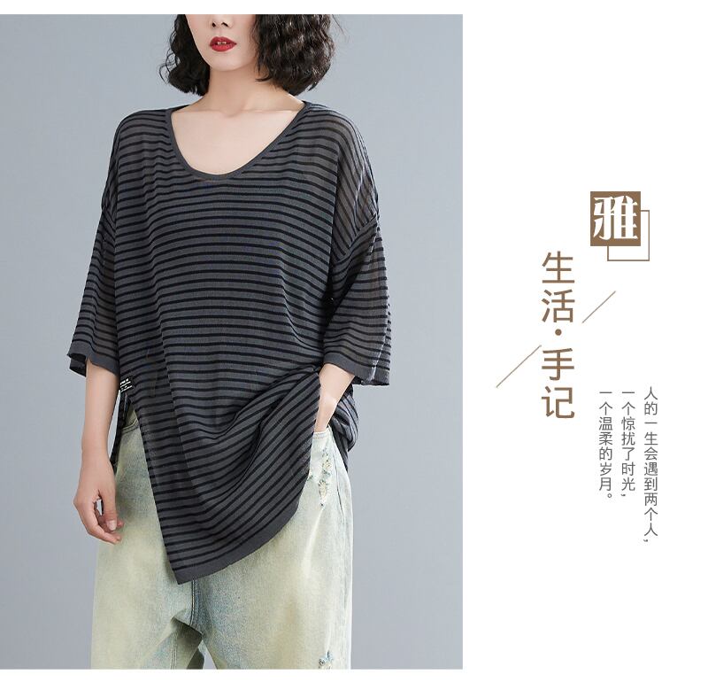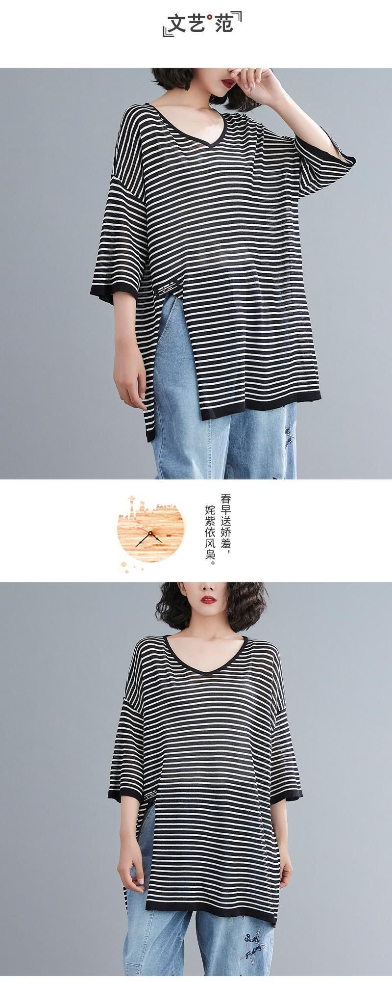ラージサイズのレディースファットmmサマーシンストライプニットTシャツレディースミドル丈ルーズバージョンの裾スリットトップ 大きめサイズ 夏物 TB2-8 TB2-891153867019
