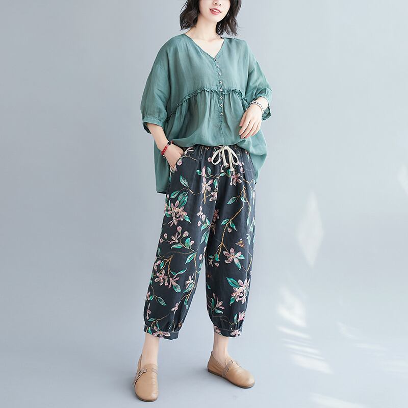 プラスサイズの女性の夏のファットシスターmmスリミングベリーカバースーツウエスタンスタイルの年齢を減らすVネックシャツ+9ポイントパンツツーピーススーツ 大きめサイズ サマー 夏物 TB2-8 TB2-833695344657