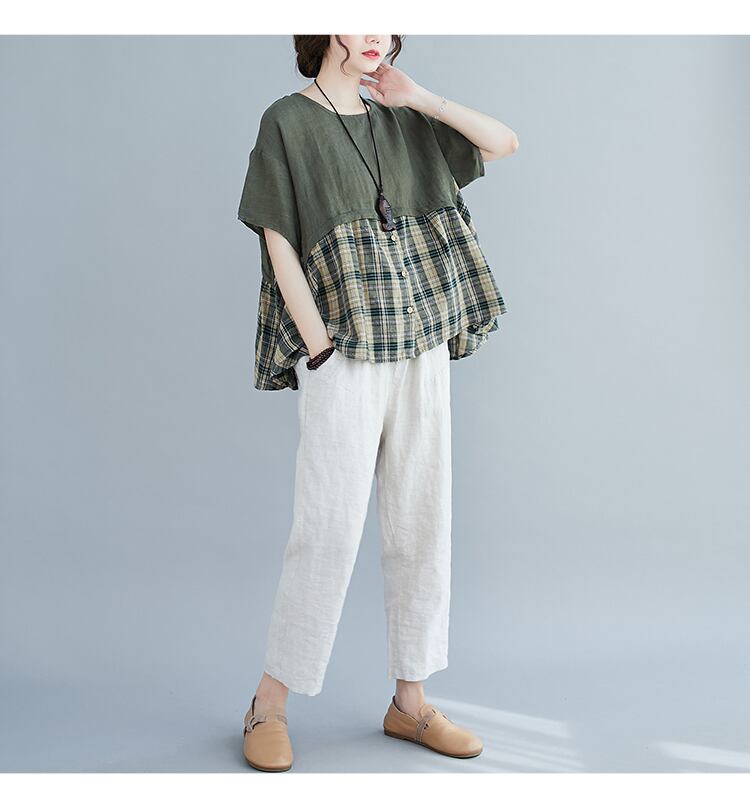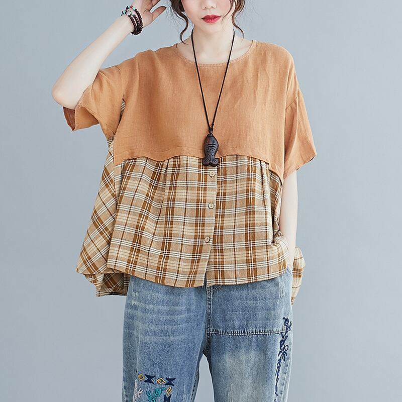 ラージサイズファットmmscheming薄いお腹のベビーシャツ女性の夏ルーズワイルドオールマッチ年齢削減チェック柄ステッチ半袖Tシャツ ショート ハーフスリーブ 大きめサイズ サマー 夏物 TB2-8 TB2-841584136350