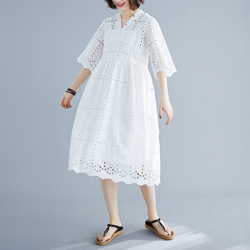 2019夏新バージョンのルーズラージサイズレディーススーパーフェアリーホワイトホローVネックワンピースは細いAラインスカート 大きめサイズ サマー 夏物 TB2-8 TB2-837794434292