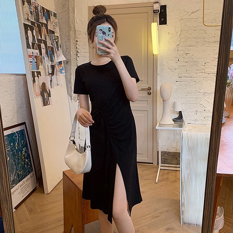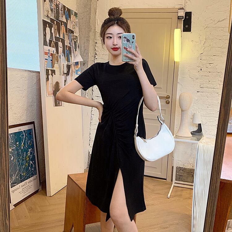 ヘップバーンドレス女性薄気質スプリットTシャツスカート200kgレトロフォールドボトミングリトルブラックスカートファットmmラージサイズ 大きめサイズ TB2-10 TB2-1056281533183
