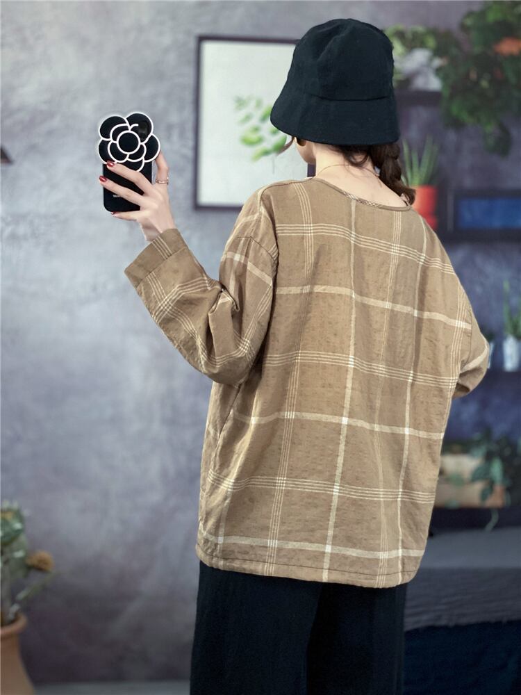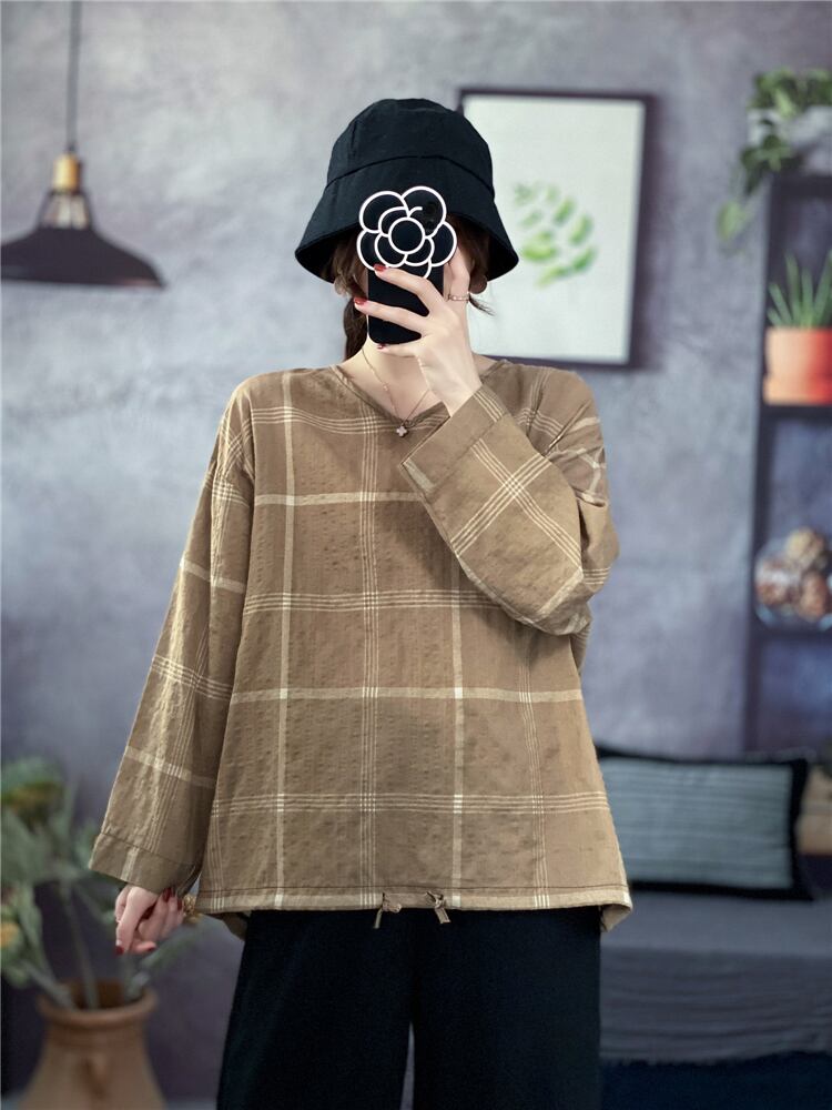 2021年春の新しいeignトレードプラスサイズのレトロな文芸的で芸術的なチェック柄のコットンとリネンのTシャツ女性用長袖Vネックカジュアルルーズトップ ロング 大きめサイズ スプリング 春物 TB2-59 TB2-5982433077403