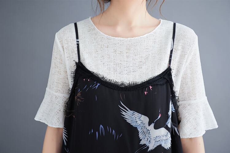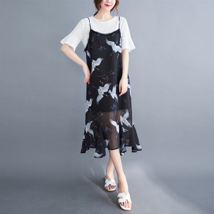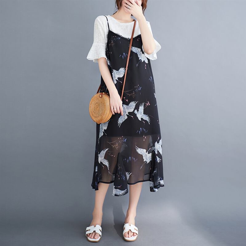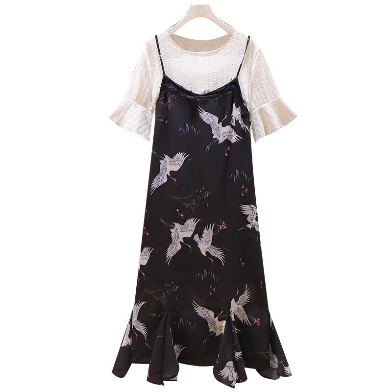 プラスサイズの女性の太ったmm年齢を減らす夏の半袖Tシャツ+スリングシフォンドレスファッショナブルなチャイニーズスタイルのツーピーススーツ 大きめサイズ サマー 夏物 TB2-8 TB2-883676387509