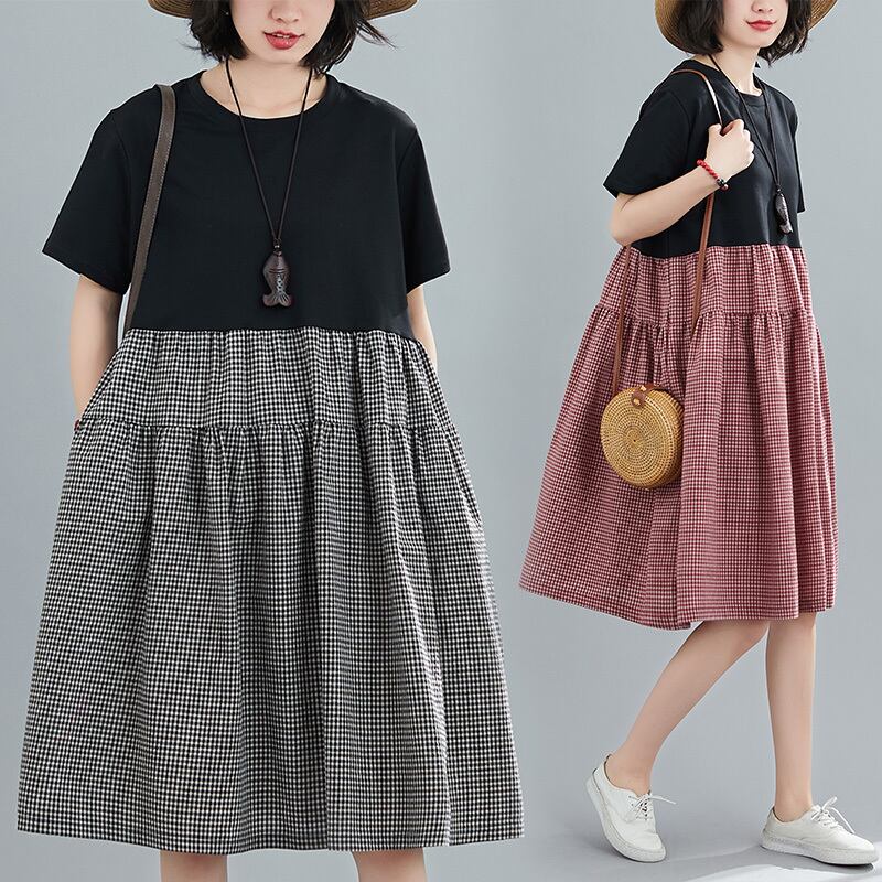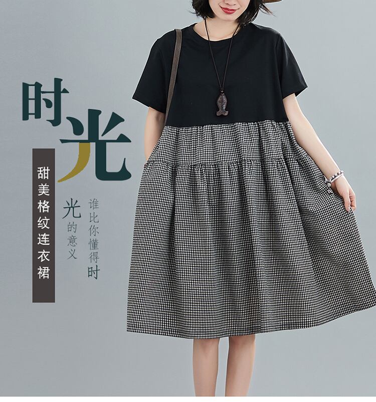 Xiaofeijia〜夏の文学的なレトロな格子縞のステッチ半袖ドレスお腹と薄いをカバーする女性のルーズベビースカート サマー 夏物 TB2-8 TB2-870379978340