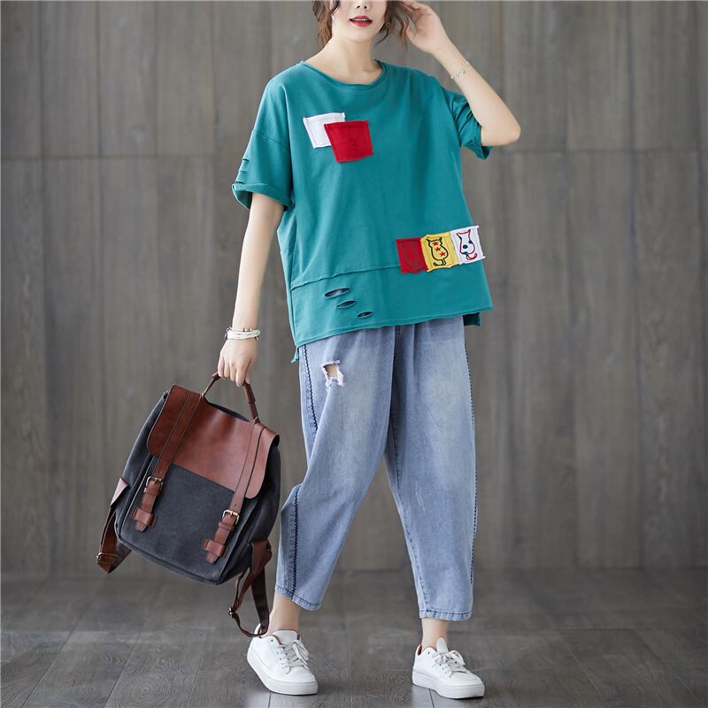 大きいサイズの女性の夏のコントラストカラーパッチ刺繡ボトミングシャツは薄くて用途が広い半袖Tシャツ女性のルーズリップトップ 刺繍 大きめサイズ サマー 夏物 TB2-8 TB2-860410321619