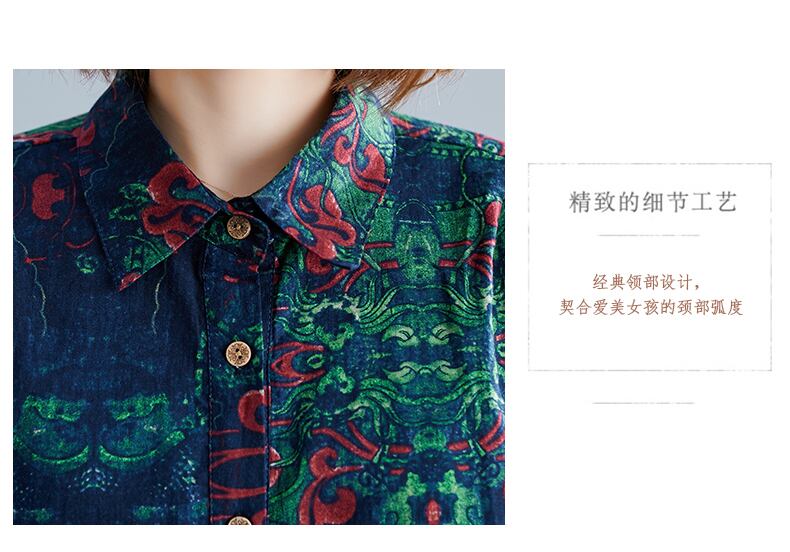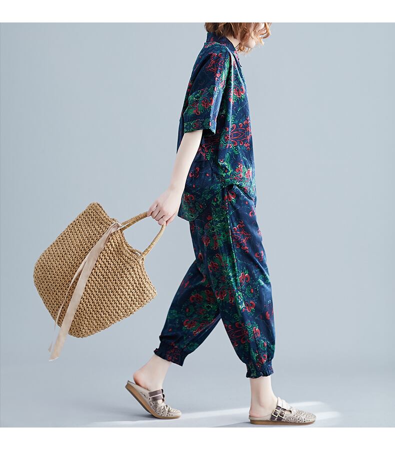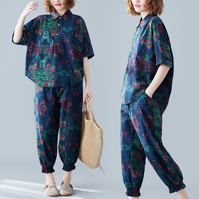 レトロなコットンとリネンのプリントプラスサイズの女性用ファットシスターブラウス+ルーズクロップドパンツウエスタンスタイルの薄いツーピーススーツの潮 大きめサイズ TB2-53 TB2-5387638309486