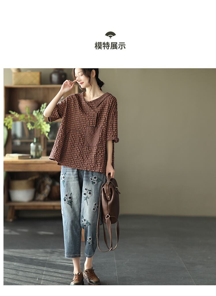 2021年の新しいレトロなコットンとリネンのチェック柄シャツレディース夏の文学的なプルオーバー人形シャツオールマッチカジュアルトップ サマー 夏物 TB2-24 TB2-2599571427770