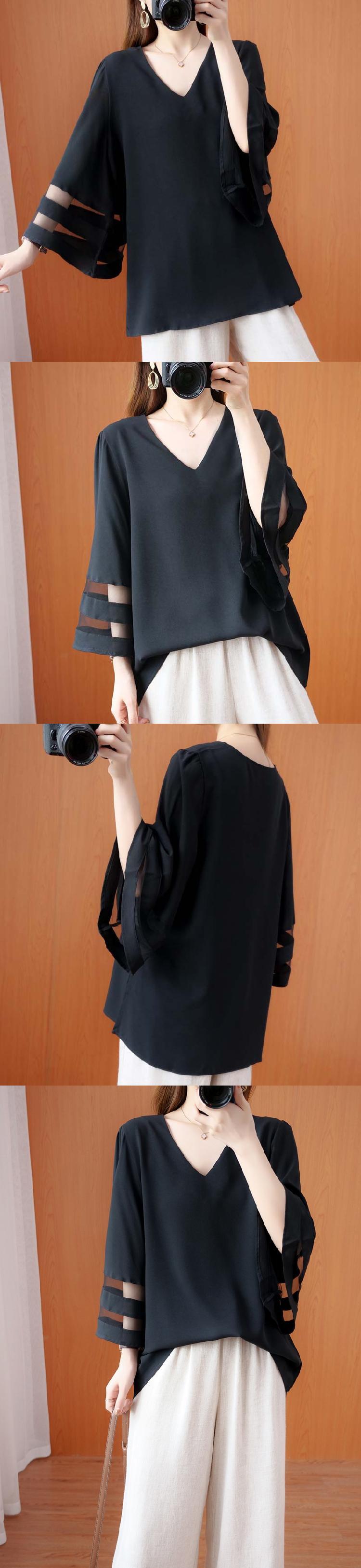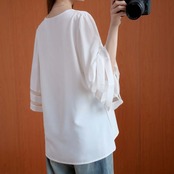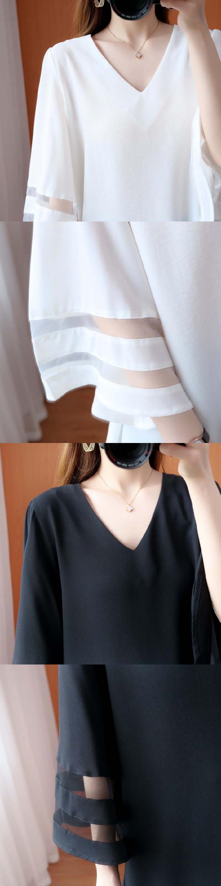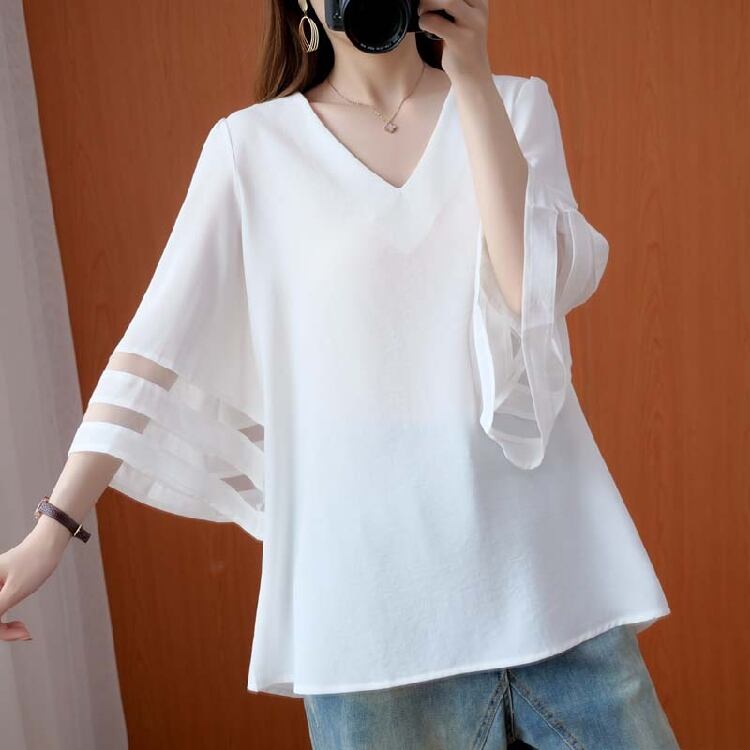 サマーファッションホローステッチホーンスリーブVネックルーズベリーカバーTシャツプラスサイズレディースファットシスタースリムシャツ ベルスリーブ 大きめサイズ 夏物 TB2-53 TB2-532629145132