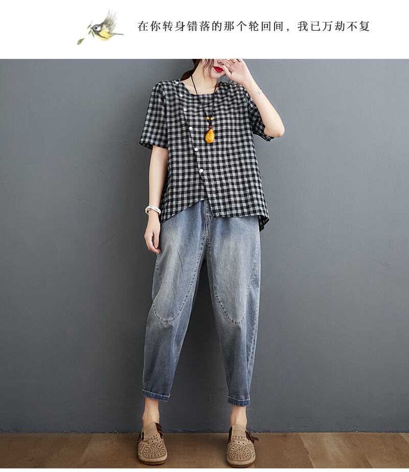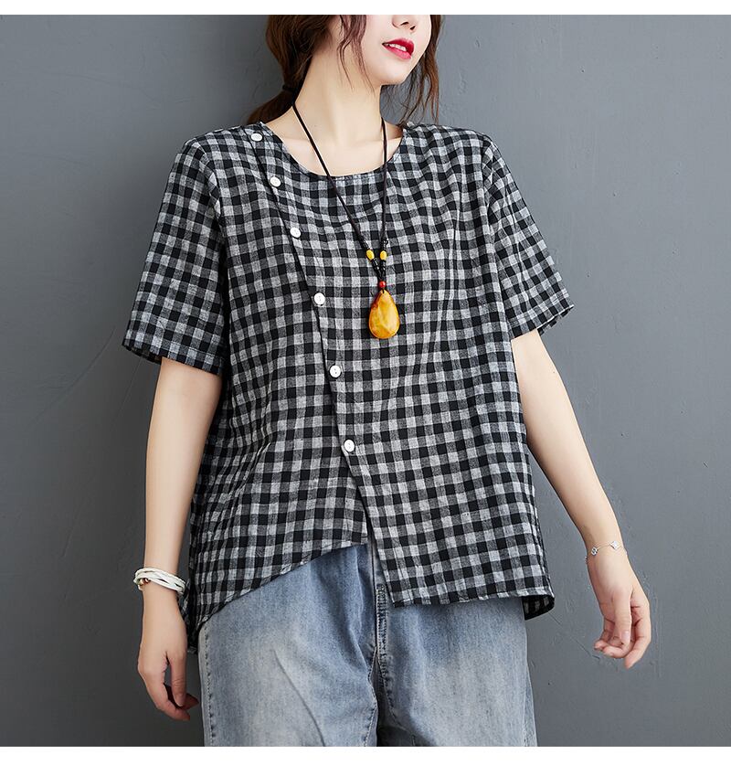 2020年夏の新しいレトロなコットンとリネンのチェック柄トップルーズウエスタンスタイルの不規則な裾半袖Tシャツの女性 サマー 夏物 TB2-8 TB2-862515379435