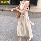 アイスシルクVネックニットノースリーブドレス、サマーウエストネクタイ、薄いフロントショートバックロング気質ベストロングスカート 夏物 TB2-52 TB2-5229220613174