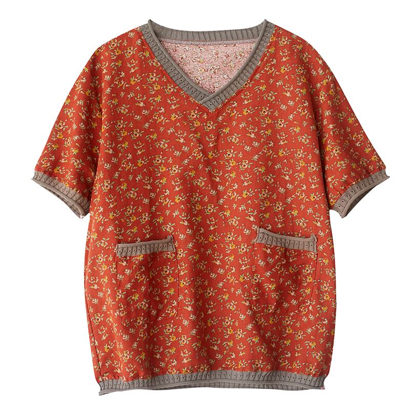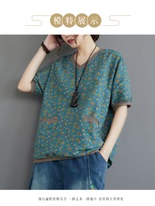 文学とアートのレトロなフローラルVネックコットンとリネンのTシャツの女性の夏のモデルは、ルーズで薄いプルオーバー半袖ボトミングシャツにすべてマッチします サマー 夏物 花柄 TB2-12 TB2-1226184349531
