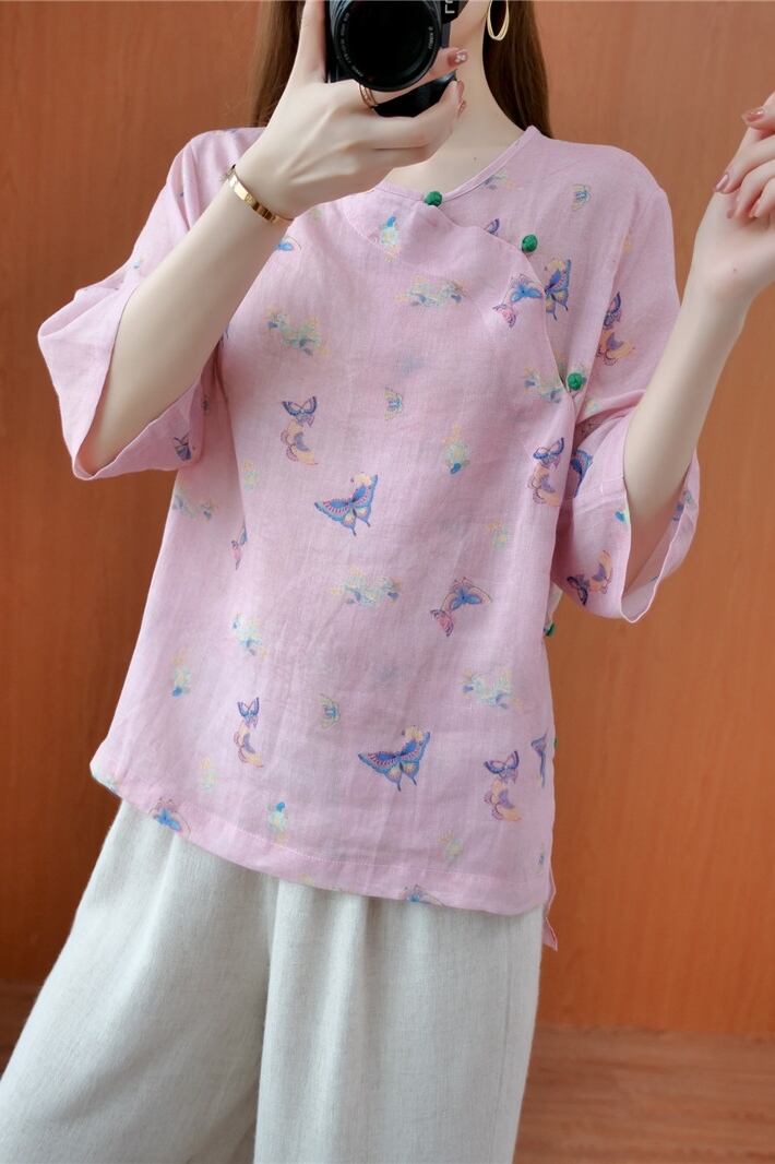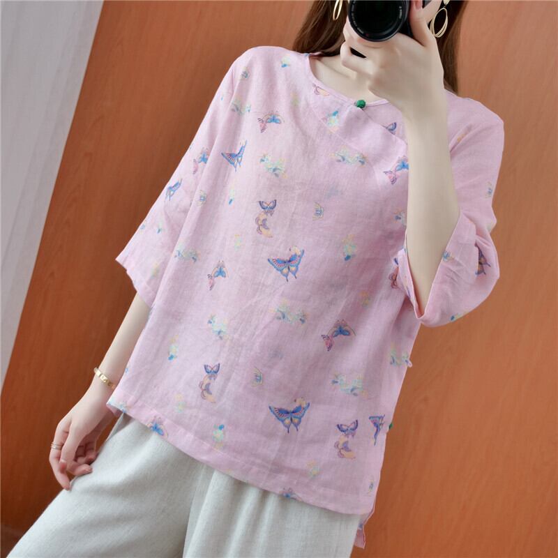 文学と芸術のエスニックスタイルのレトロなディスクボタン女性2021年夏の新しいジャケットカジュアルなルーズコットンとリネン半袖Tシャツ薄いセクション サマー 夏物 TB2-12 TB2-1292264553413