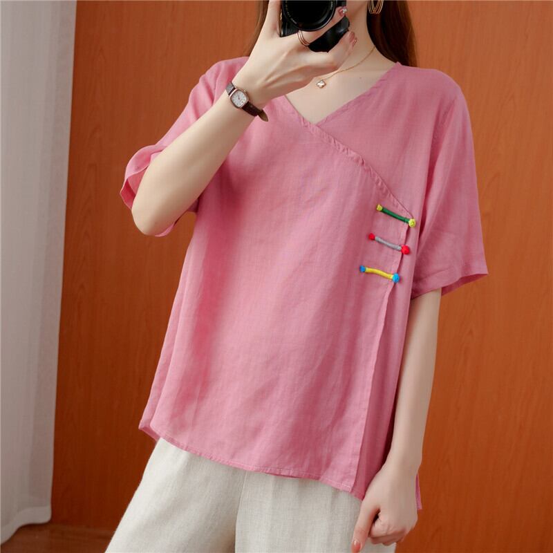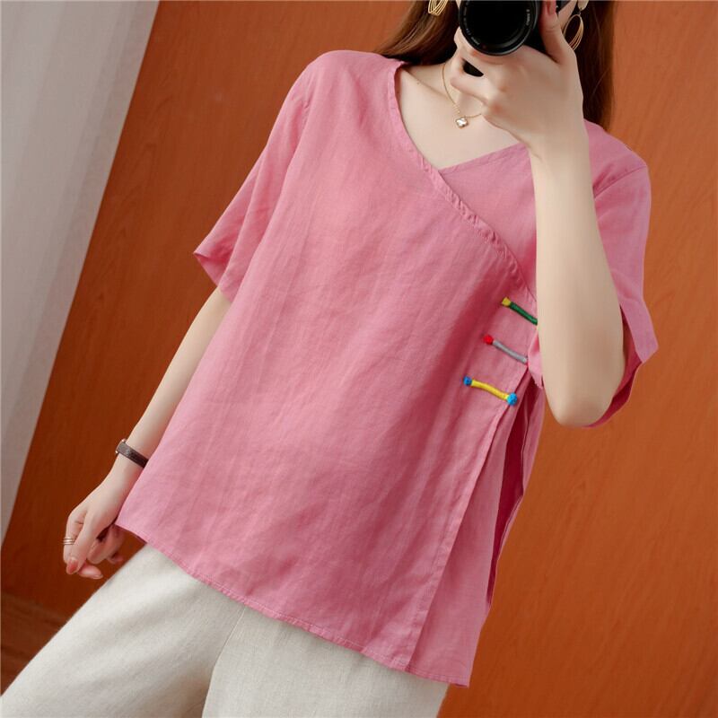 コットンリネンディスクボタンVネックシャツレディースサマーシンスタイルリテラシーレトロダイアゴナルルーズリネントップカジュアル半袖Tシャツ 夏物 TB2-12 TB2-1215317090284