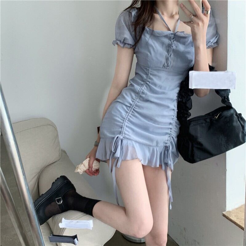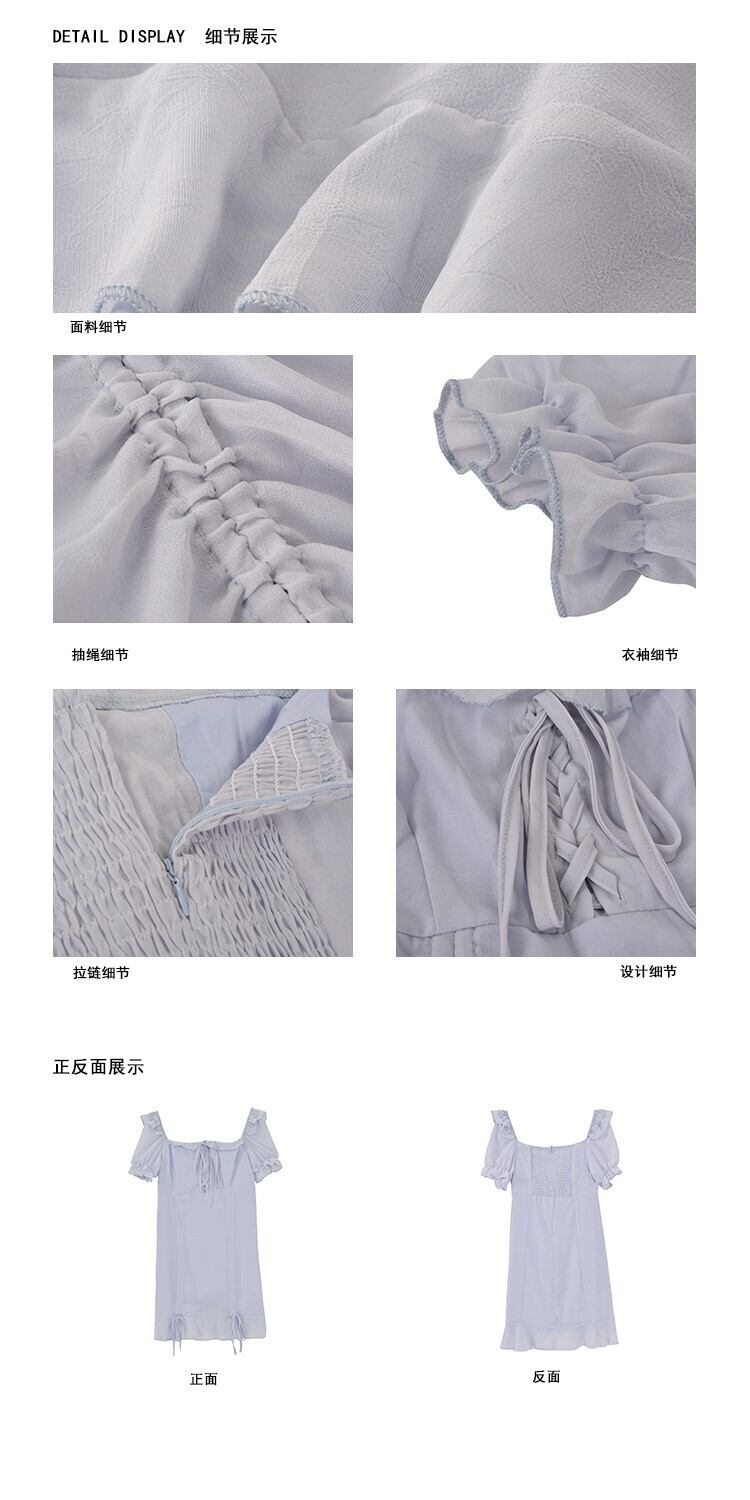 レトロな小さなパフスリーブハイウエストスカートは、妖精の春と夏の薄い巾着スクエアカラー気質ドレスを慎重に機械加工します ハイウェスト スプリング 春物 サマー 夏物 スクウェア TB2-6 TB2-640585181898