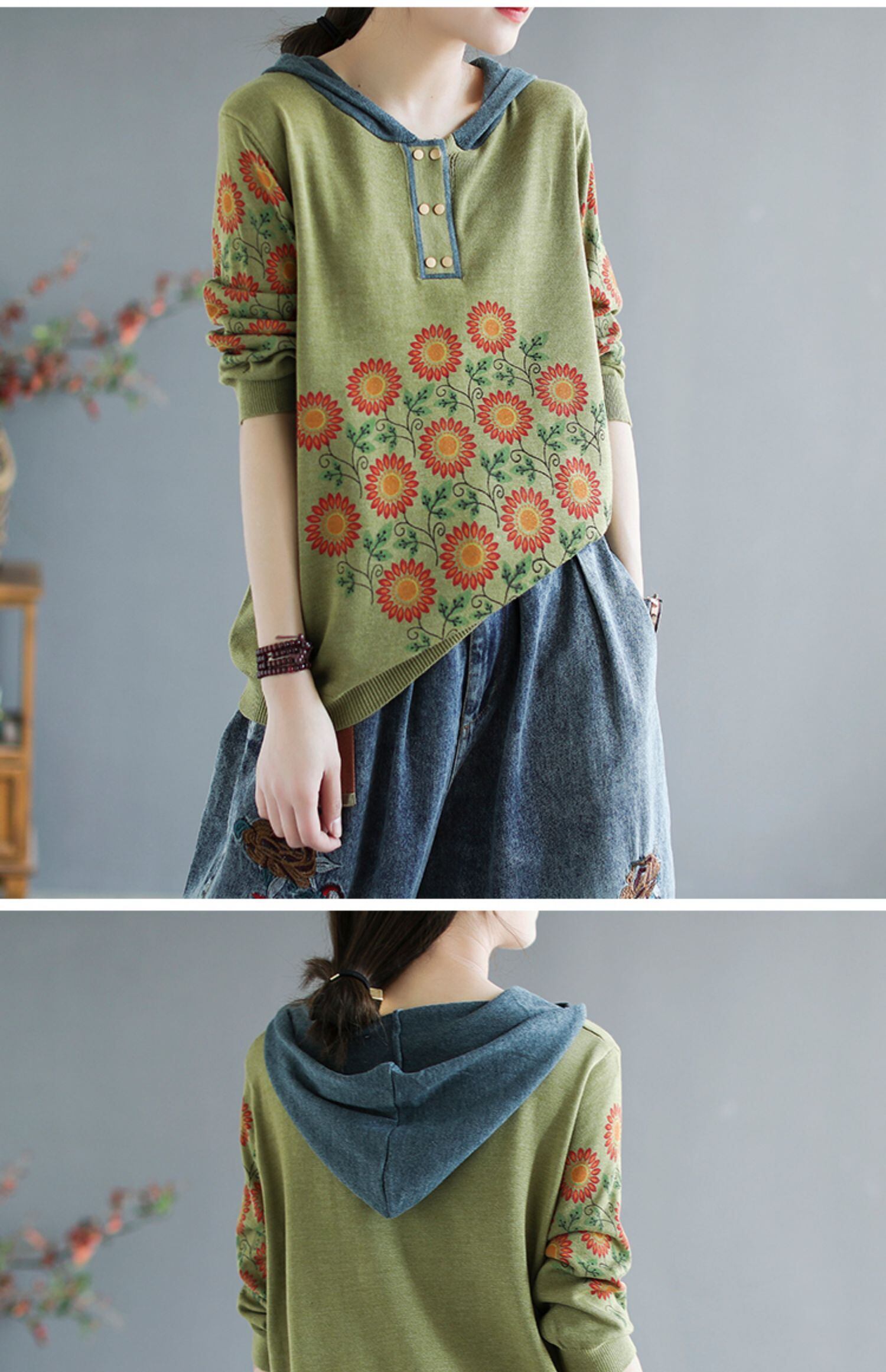 2021年の新しいレトロな春のプリント薄いニットセーター女性のプルオーバールーズレイジースタイルフード付きアウターウェアボトミングシャツ スプリング 春物 TB2-56 TB2-5610220336964