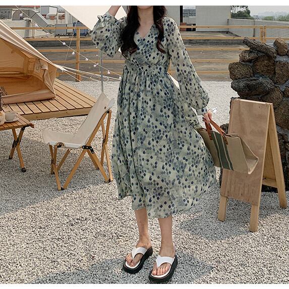 ヨーロッパとアメリカのeignトレード春のお金のウエストVネックホワイトフレンチ気質ロングスカートaラインプリーツフローラルシフォンドレス女性 スプリング 春物 花柄 ヨーロピアン TB2-68 TB2-6885564177535