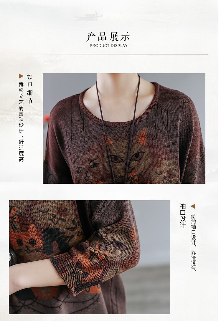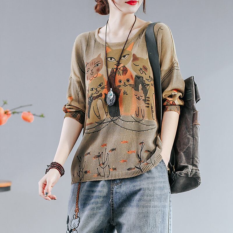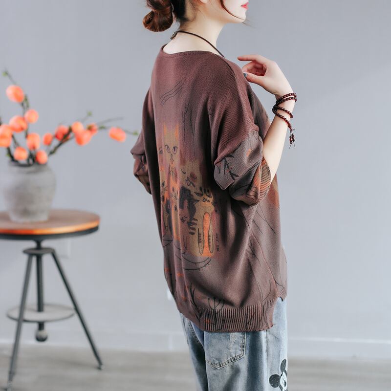 レトロなラウンドネックの漫画の印刷七分袖Tシャツ女性ルーズで薄いニットセータートップ薄いカジュアルなボトミングシャツ Oネック TB2-56 TB2-5622556524281