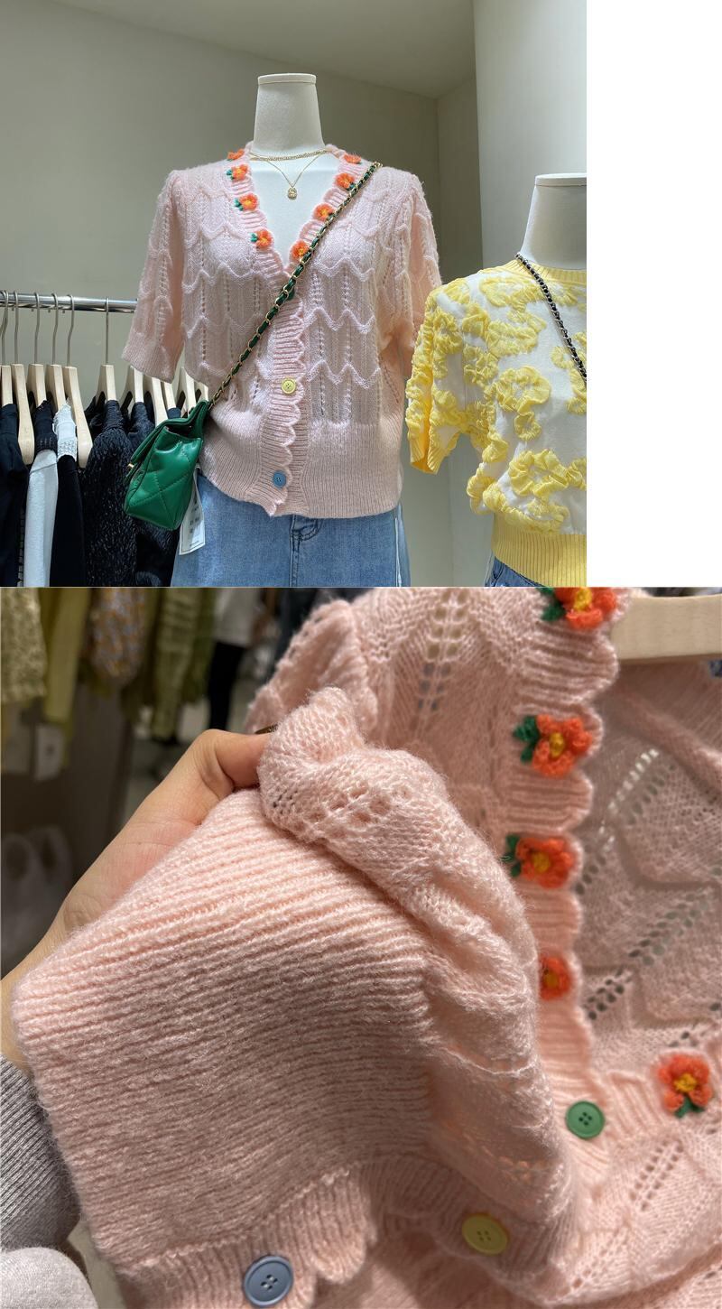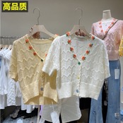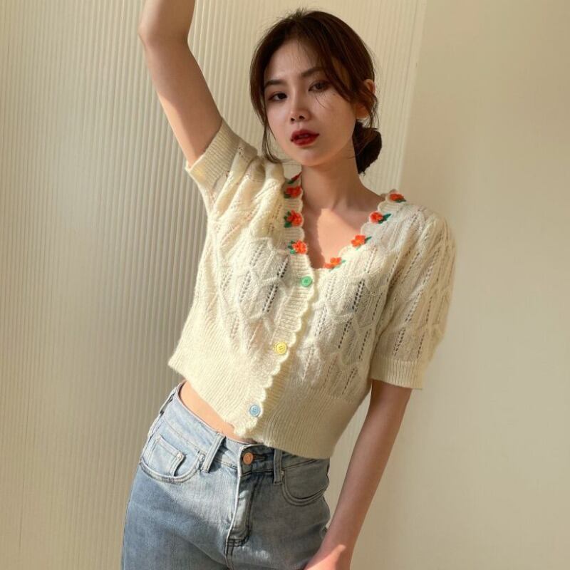 南中空Vネック半袖ニットカーディガンショート女性サマースタイル刺繍花薄手のセーターコートトップ レッド 夏物 フラワーデザイン TB2-52 TB2-5269219230205