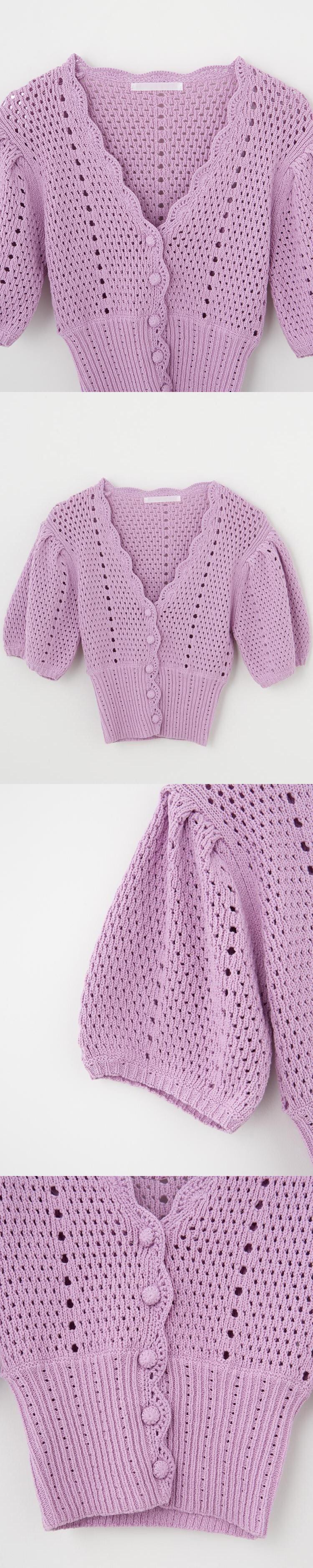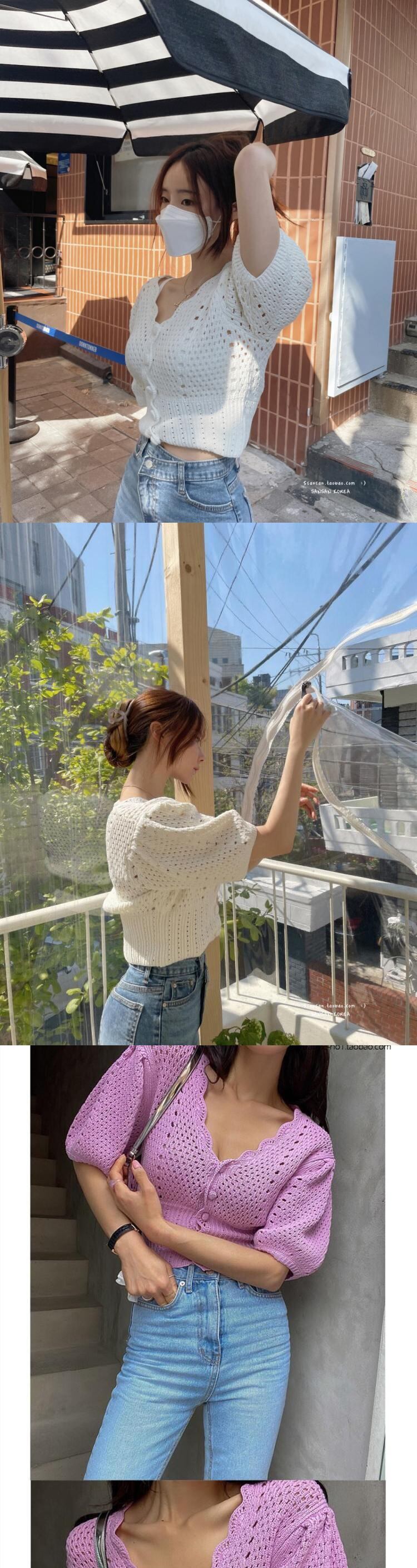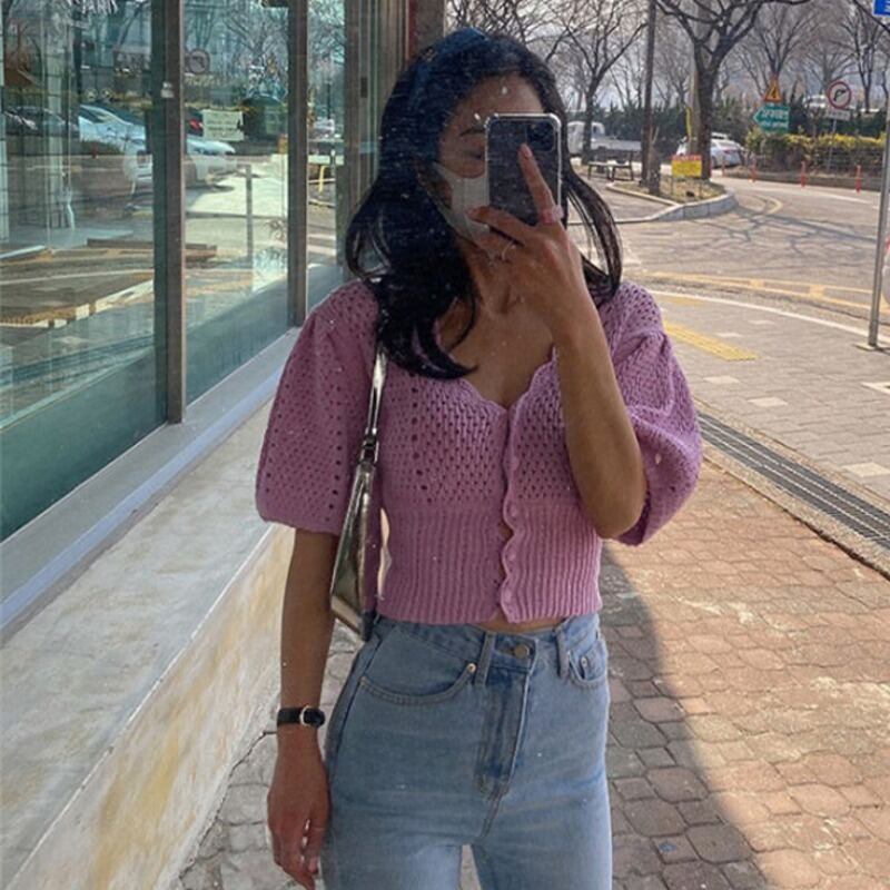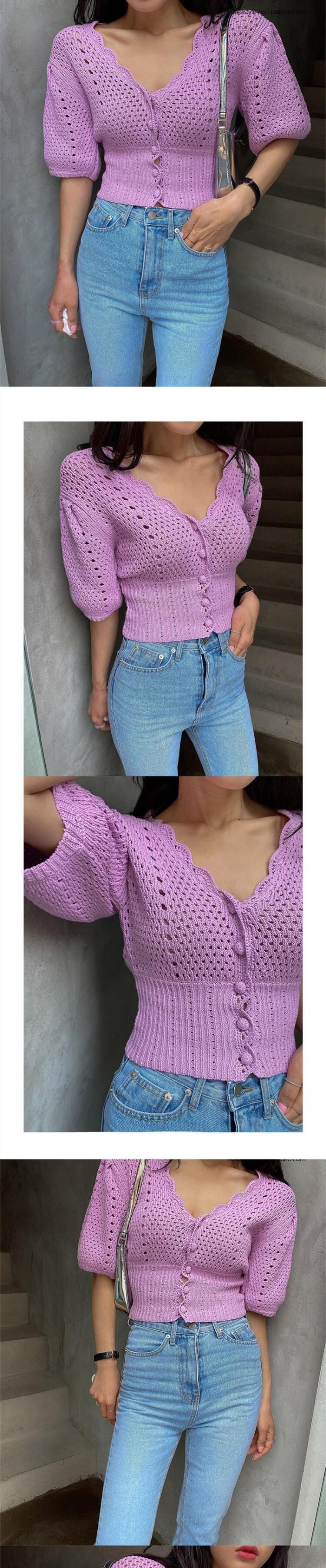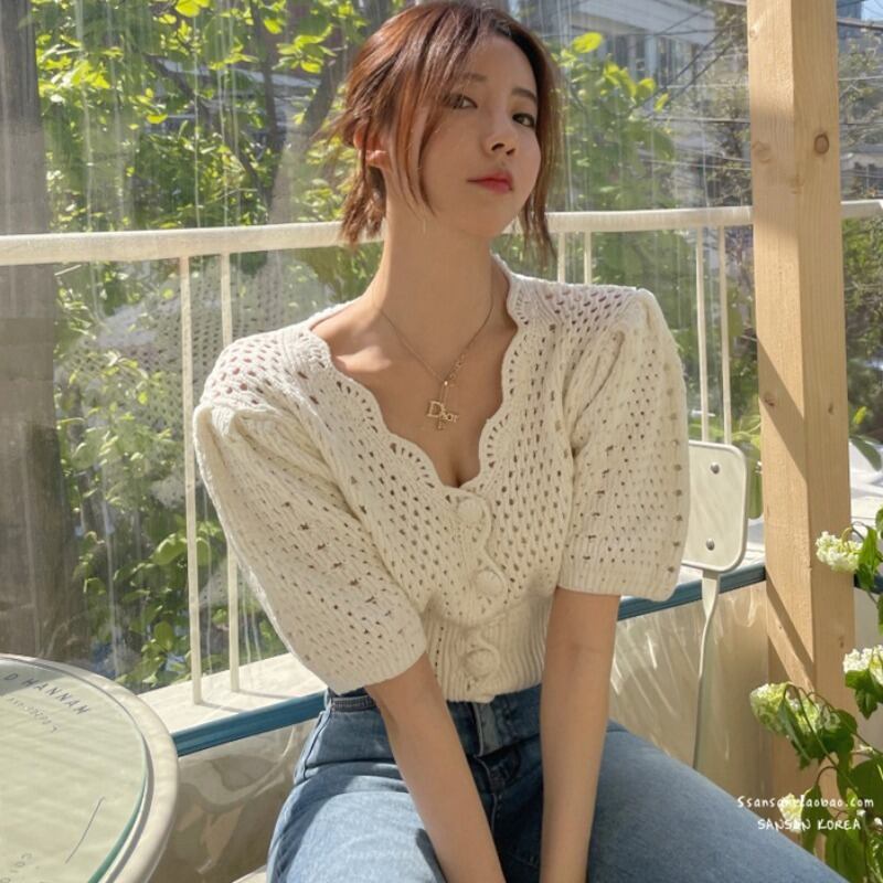 レトロ気質中空細いVネックニットカーディガン女性夏ショートパフスリーブトップセータージャケット サマー 夏物 TB2-52 TB2-5279846801008