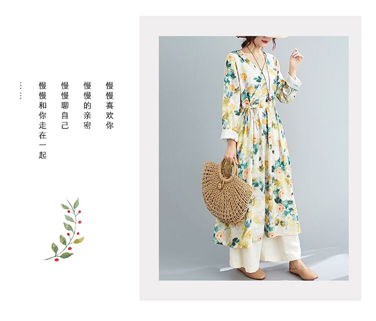 年齢を減らすプラスサイズの女性用リネンドレス秋のルーズVネックレトロプリント膝上に薄いコットンとリネンの大きなスイングスカート 大きめサイズ オータム 秋物 TB2-50 TB2-5025245438108