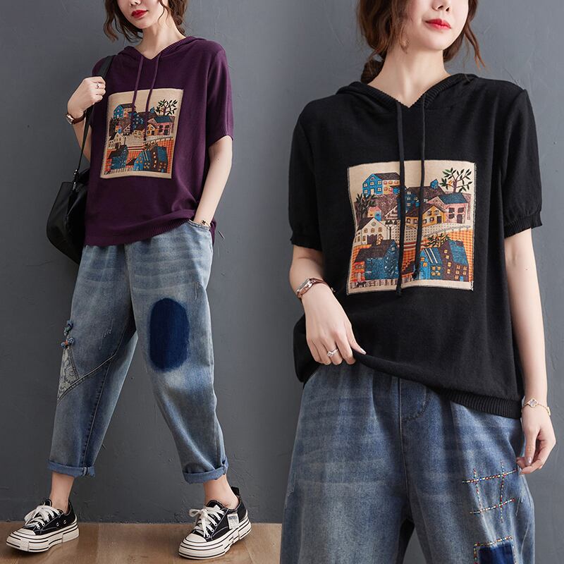 フード付きTシャツレディースサマードレス2021ニューアートプリント半袖ニットトップレディースルーズカジュアルヘッジオールマッチ 夏物 TB2-49 TB2-4952464492549