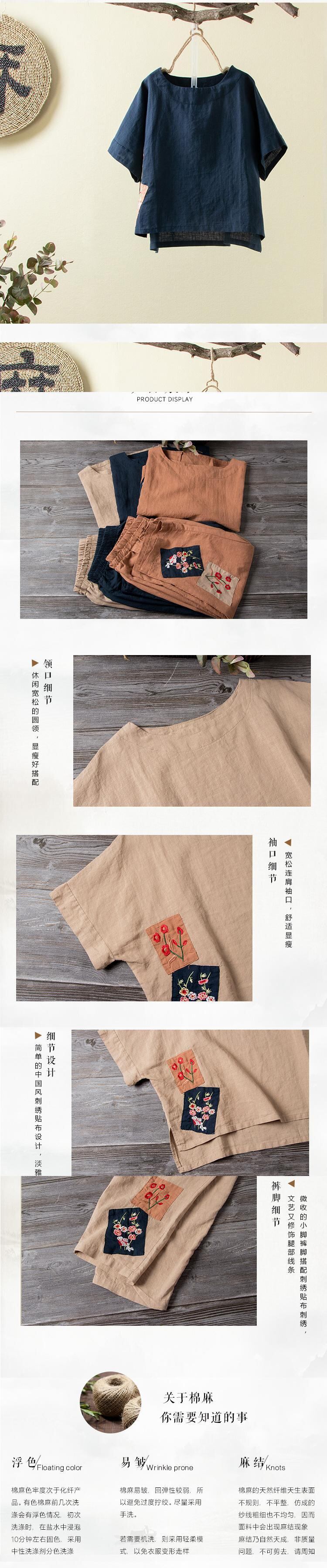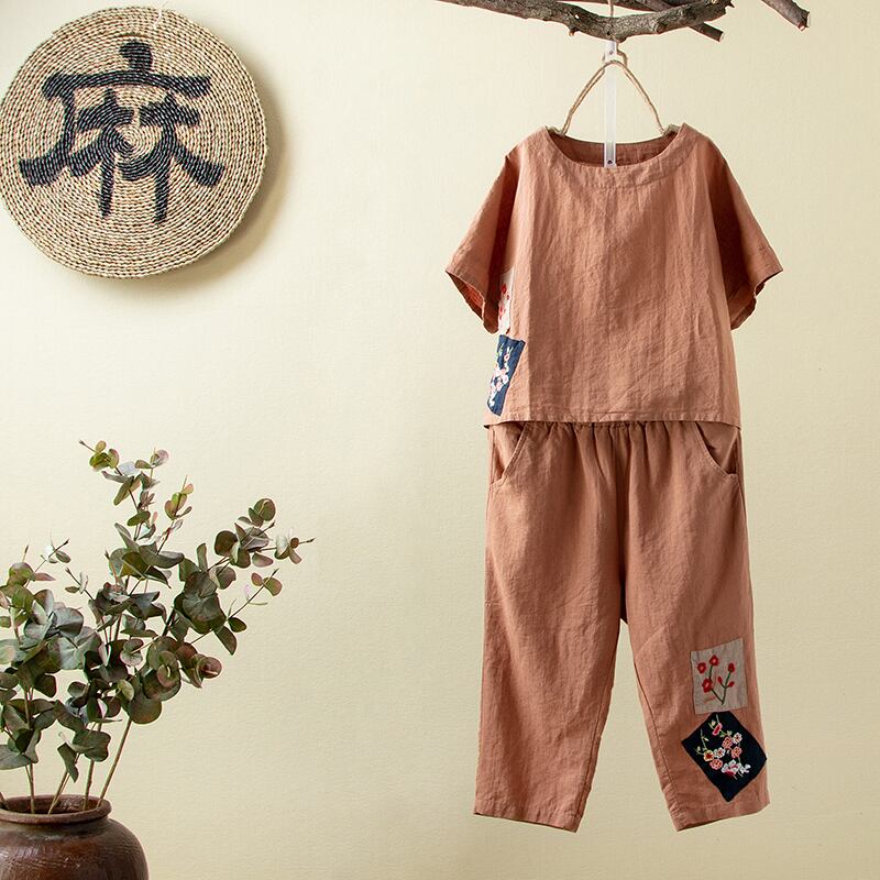 SuyiLaneサマールーズラージサイズ半袖Tシャツレディースパッチクロップドパンツコットンリネンパンツレトロアートリネンスーツ ショート ハーフスリーブ 大きめサイズ 夏物 TB2-56 TB2-5628653993573