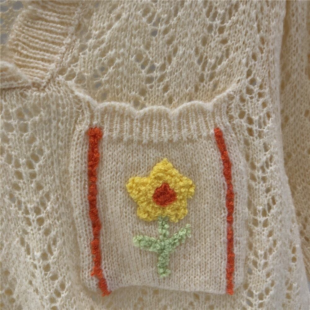 ハンドンデムン優しい襟繡花花中空薄ニットセーターショート女性夏ルーズパフスリーブトップ 刺繍 サマー 夏物 フラワーデザイン TB2-52 TB2-5223834713247