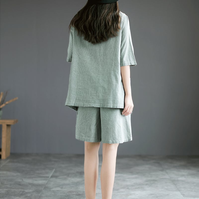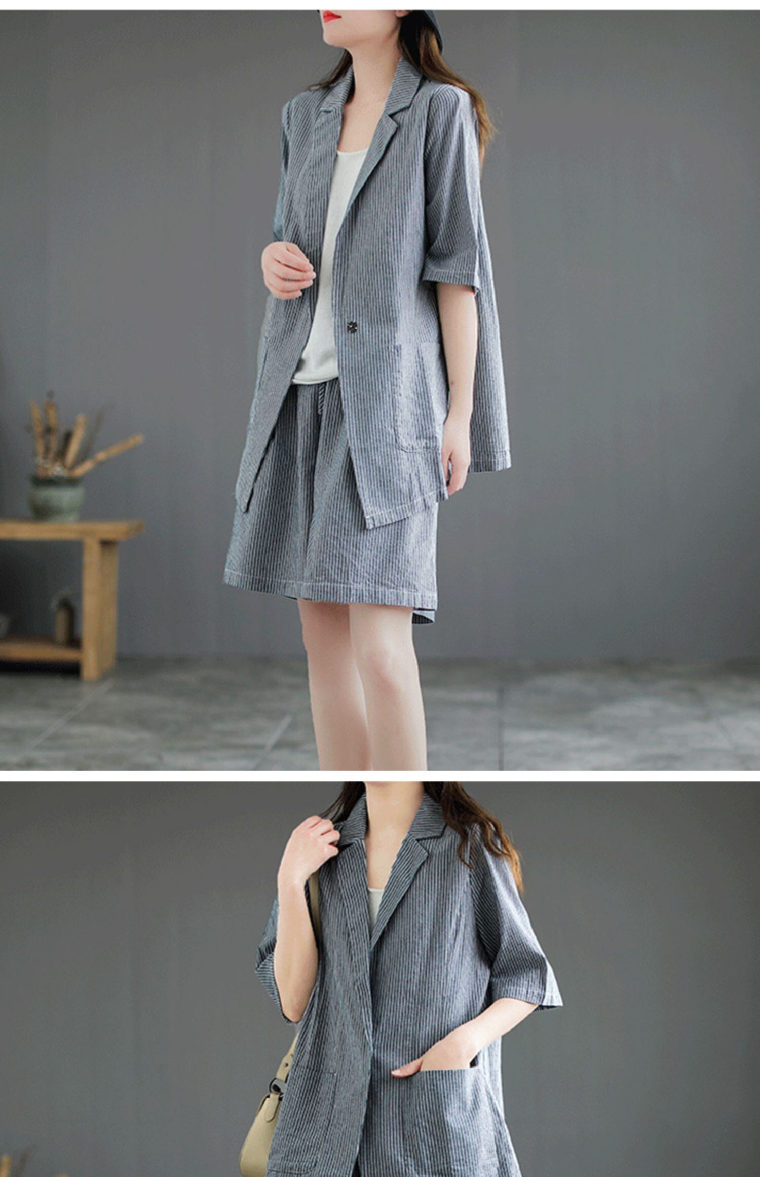 2021年夏の薄いスタイルの文学的なカジュアルスーツスーツ女性の縞模様のスーツジャケット弾性巾着ショーツツーピーススーツ エラスティック 伸縮 サマー 夏物 ブルマー ストライプ TB2-56 TB2-5624573863472