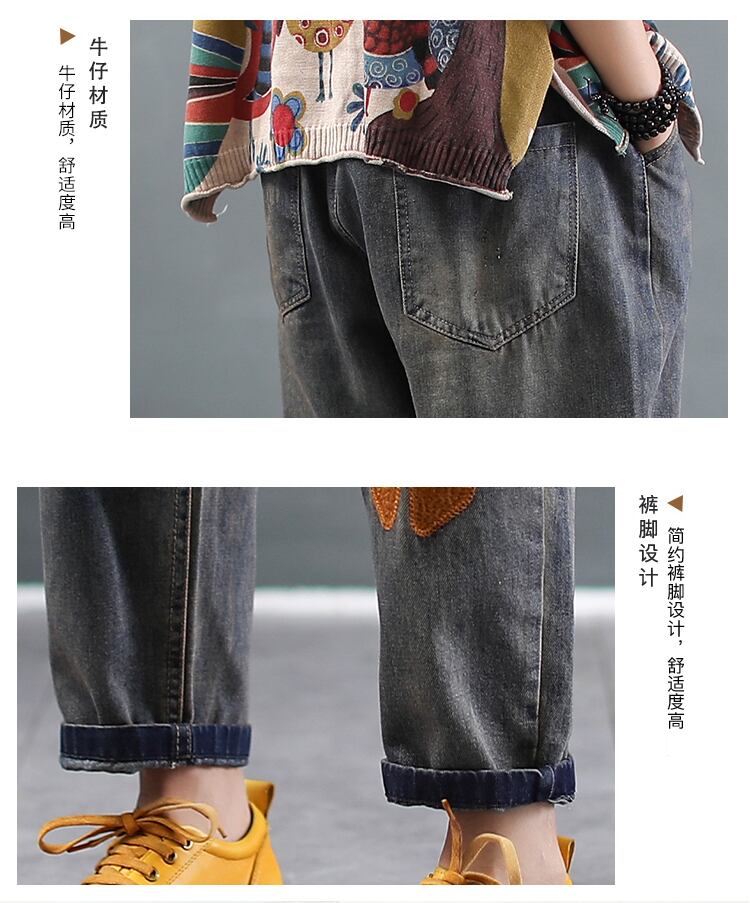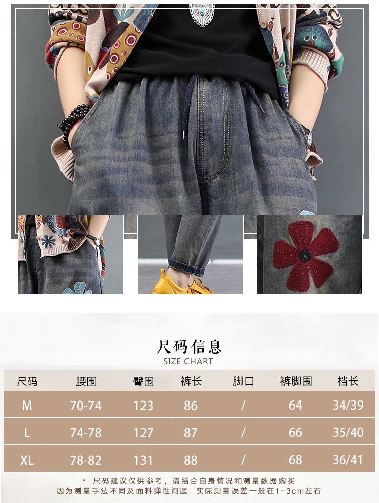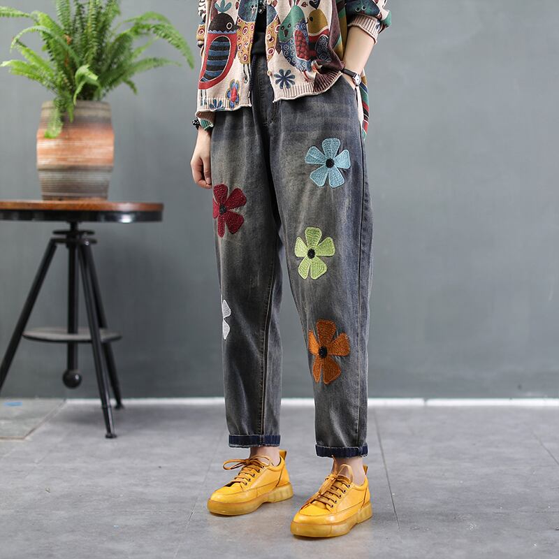 Suyixiang秋のスタイルレトロな芸術的な女性の刺繡ジーンズ弾性ウエストウエスト薄いニンジンパンツハーレムパンツパンツ レッド 刺繍 エラスティック 伸縮 オータム 秋物 TB2-56 TB2-5679914778323