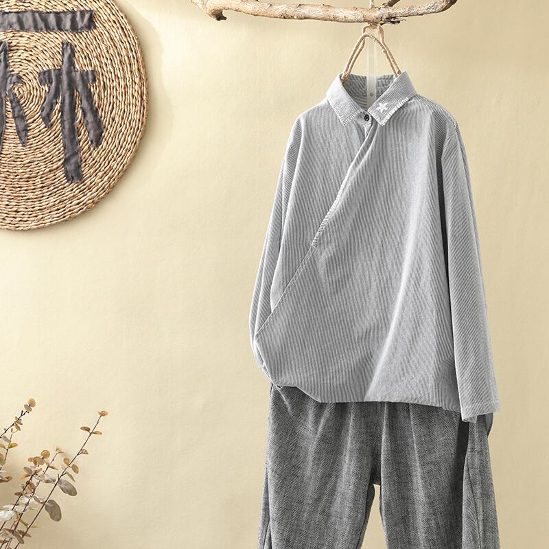SuyiLane文芸刺繍ストライプ斜めシャツルーズコットンとリネン長袖シャツレディース2020春ニュートップ ロング スプリング 春物 TB2-56 TB2-5630093533432
