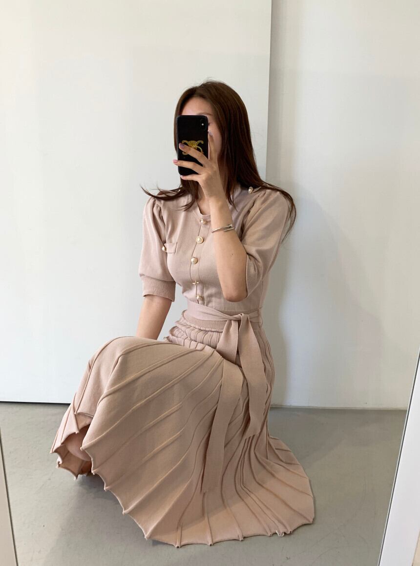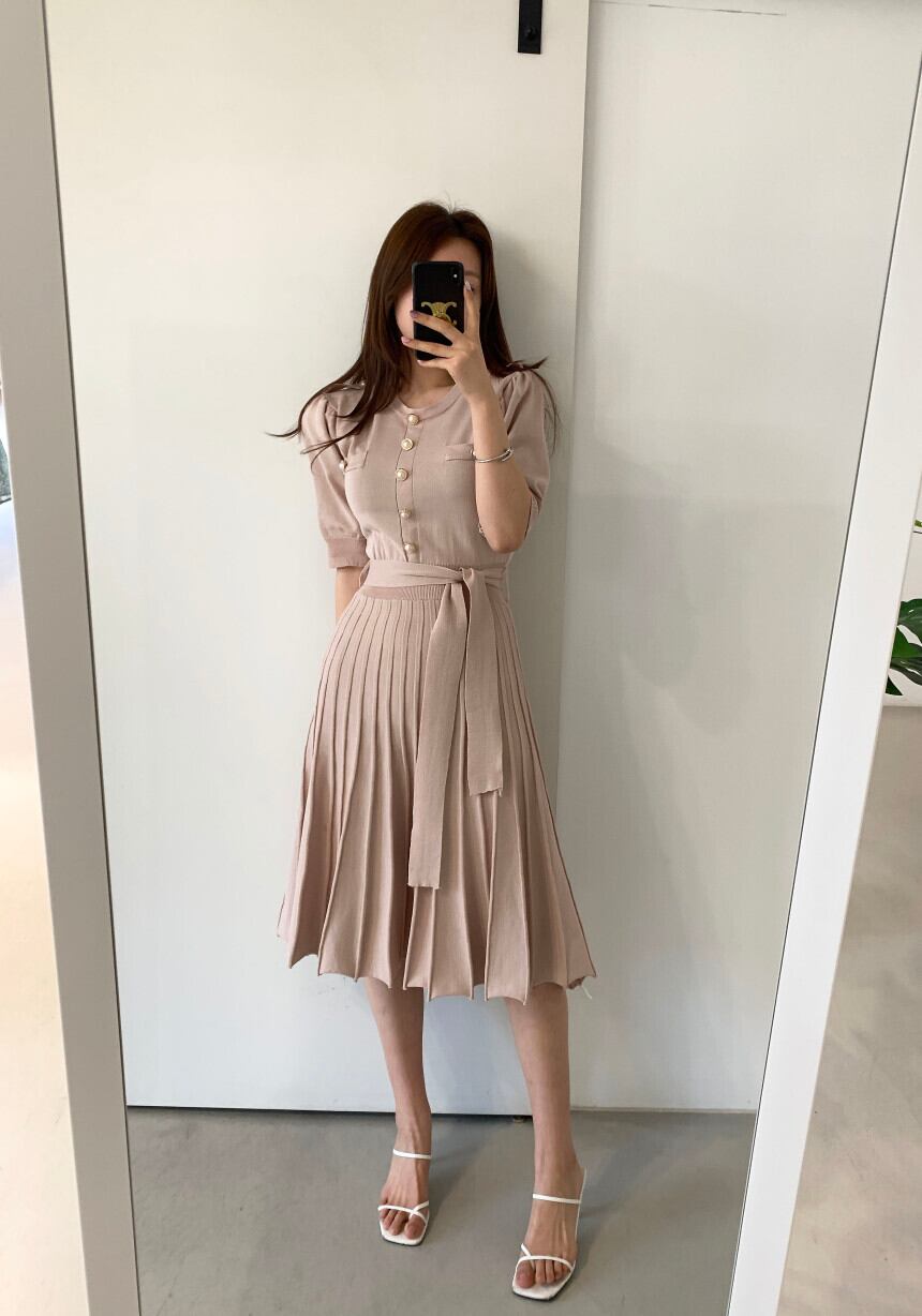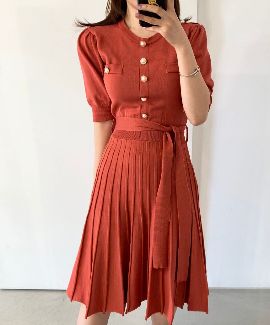 小さな香りの気質アイスシルクニットドレス半袖女性の夏のウエストベルト痩身スリムプリーツロングスカート サマー 夏物 ハーネス TB2-52 TB2-522530138331