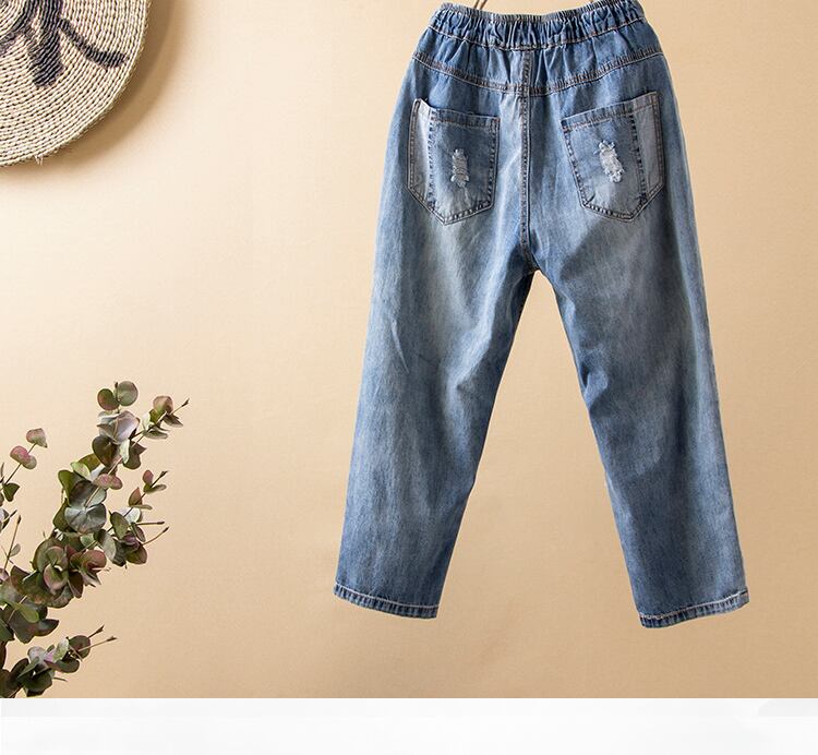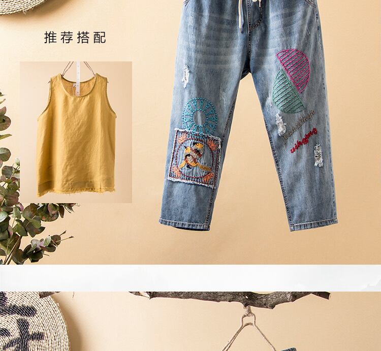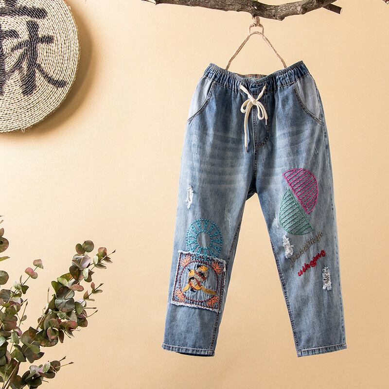 SuyiLane文学とアート刺繍入りルーズジーンズレディースサマースタイルオールドポケットパッチステッチクロップドハーレムパンツ レッド 夏物 TB2-56 TB2-5677678443433