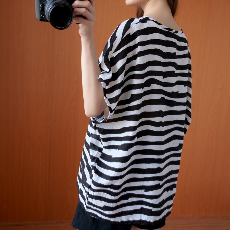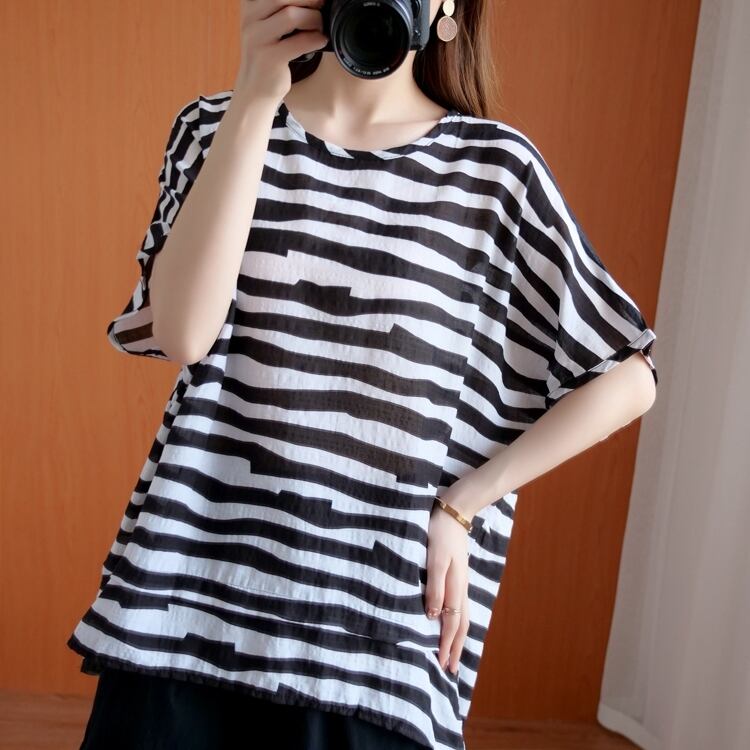 2020年夏のファットmmプラスファット拡大Tシャツルーズ隠し肉薄縞ラウンドネック半袖シャツプラスサイズの女性 大きめサイズ サマー 夏物 Oネック ストライプ TB2-53 TB2-5344691697352