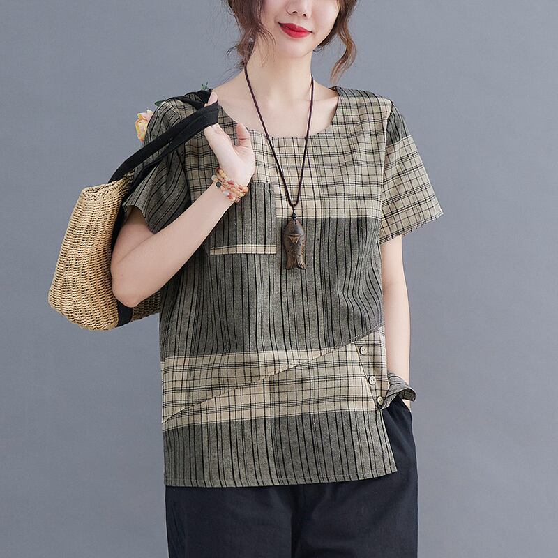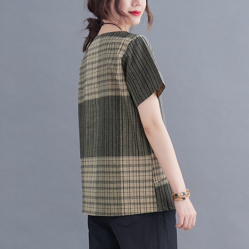 非対称のチェック柄のコットンとリネンのブラウスの女性の夏のルーズファットmm年齢削減スプリットヘムTシャツは薄いプラスサイズの婦人服でした 大きめサイズ サマー 夏物 TB2-50 TB2-5029618946752