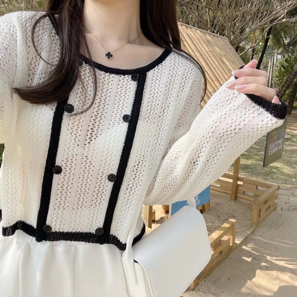 中空の薄い色のコントラストアイスシルクセーター女性夏の小さなルーズスイート長袖ブラウス香りのよい風日焼け止めトップ ロング 大人ガーリー スウィート キュート カジュアル サマー 夏物 TB2-52 TB2-5233605664867