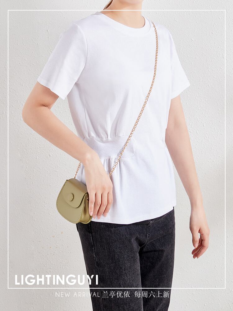 2021年夏のプラスサイズのウエストデザインショートホワイト半袖Tシャツ女性脂肪mm薄いラウンドネックボトミングトップ 大きめサイズ サマー 夏物 Oネック TB2-16 TB2-1634764593635