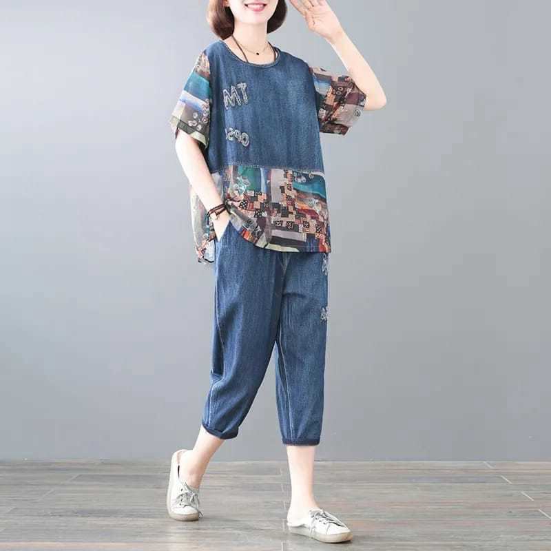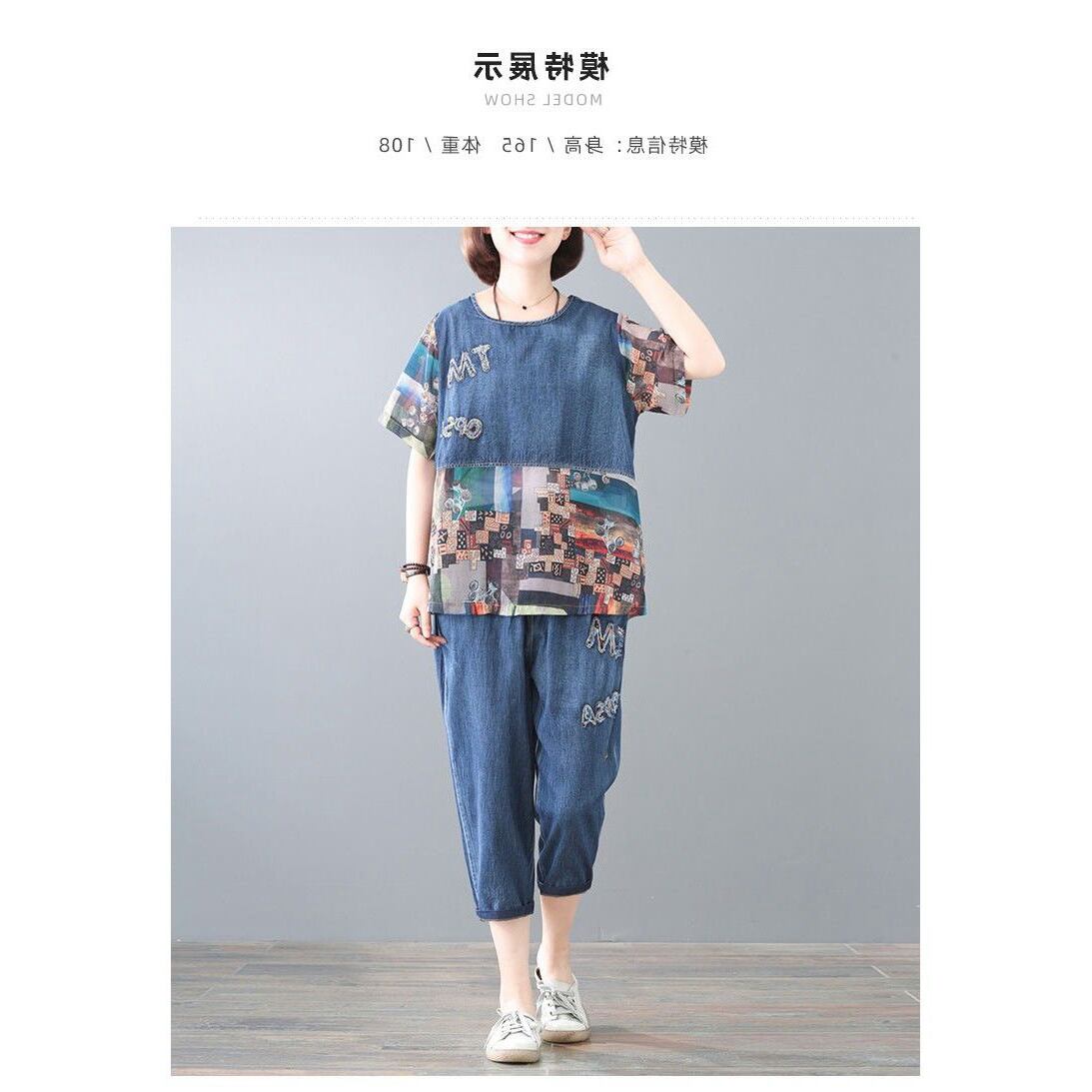 2021年新作ルーズラージサイズステッチプリントデニムスーツサマーシンレディースカジュアルスーツファッションツーピーススーツ 大きめサイズ 夏物 TB2-53 TB2-5347728513832