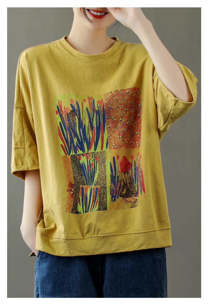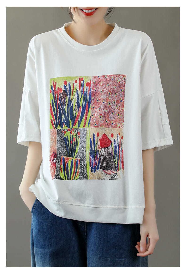 半袖コットンTシャツレディースサマーニュースタイルバージョンの文学とアートルーズラージサイズレトロプリント半袖トップスは薄くてオールマッチ 大きめサイズ 夏物 TB2-53 TB2-5376579294969