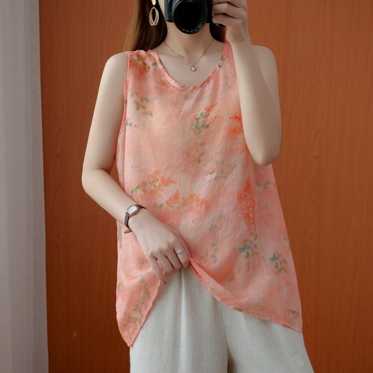 2021年夏の新しいスタイルのeignトレードプラスサイズのコットンとリネンのプリントカジュアルベストVネックノースリーブカバーベリー減少年齢トップの女性 大きめサイズ サマー 夏物 TB2-59 TB2-5920193341542