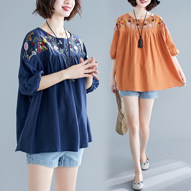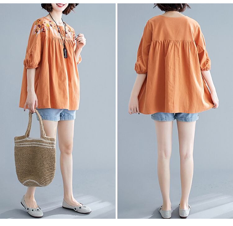 2021年夏の新しいスタイルのeignトレードラージサイズの刺繍ステッチコットンとリネンTシャツランタンスリーブラウンドネックカバーベリーベビーシャツ 大きめサイズ サマー 夏物 Oネック TB2-59 TB2-5943595384481