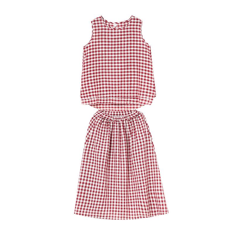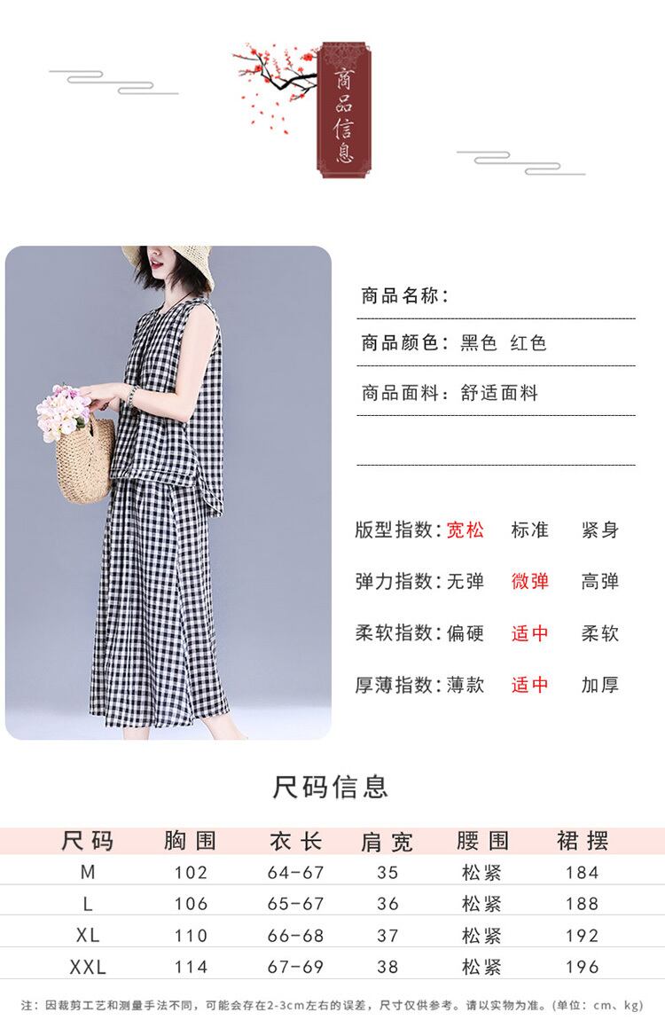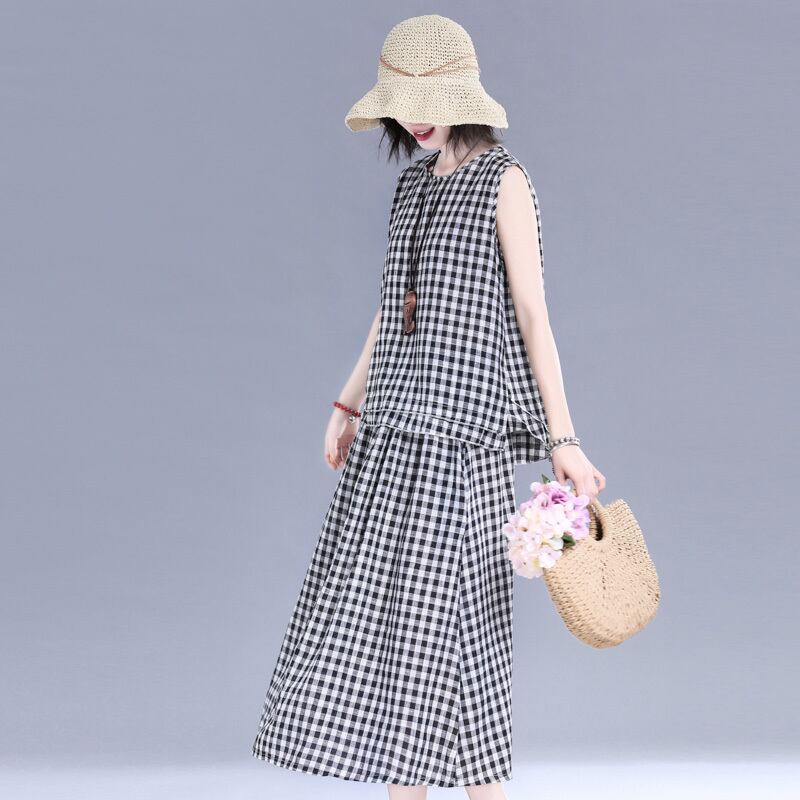 ラージサイズのコットンとリネンのツーピースサマーノースリーブベストTシャツトップカジュアルAラインスカートチェック柄リネンスーツ女性 大きめサイズ 夏物 TB2-50 TB2-5088787428825